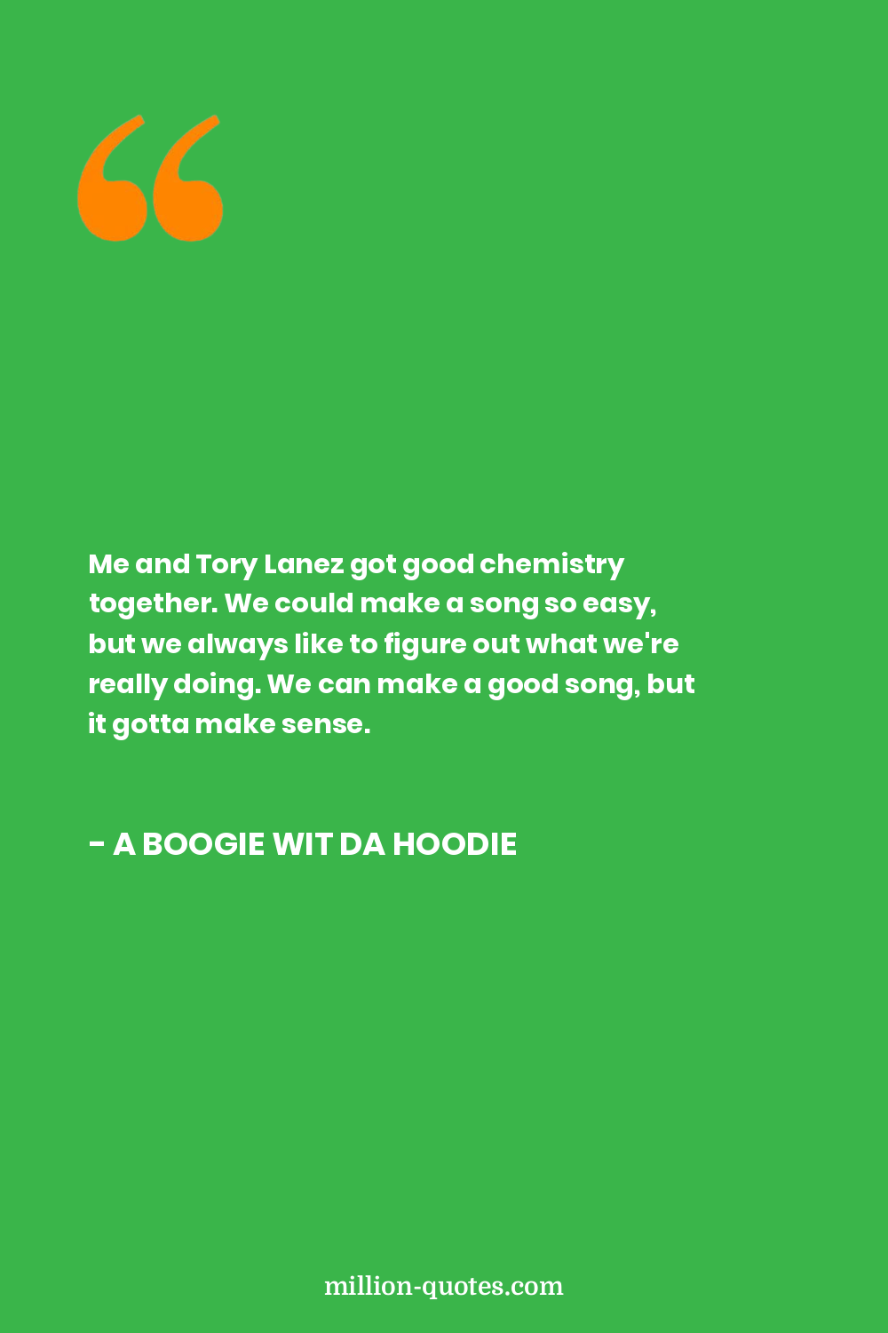 Me and Tory Lanez got good chemistry together. We could make a song so easy, but we always like to figure out what we're really doing. We can make a good song, but it gotta make sense.
