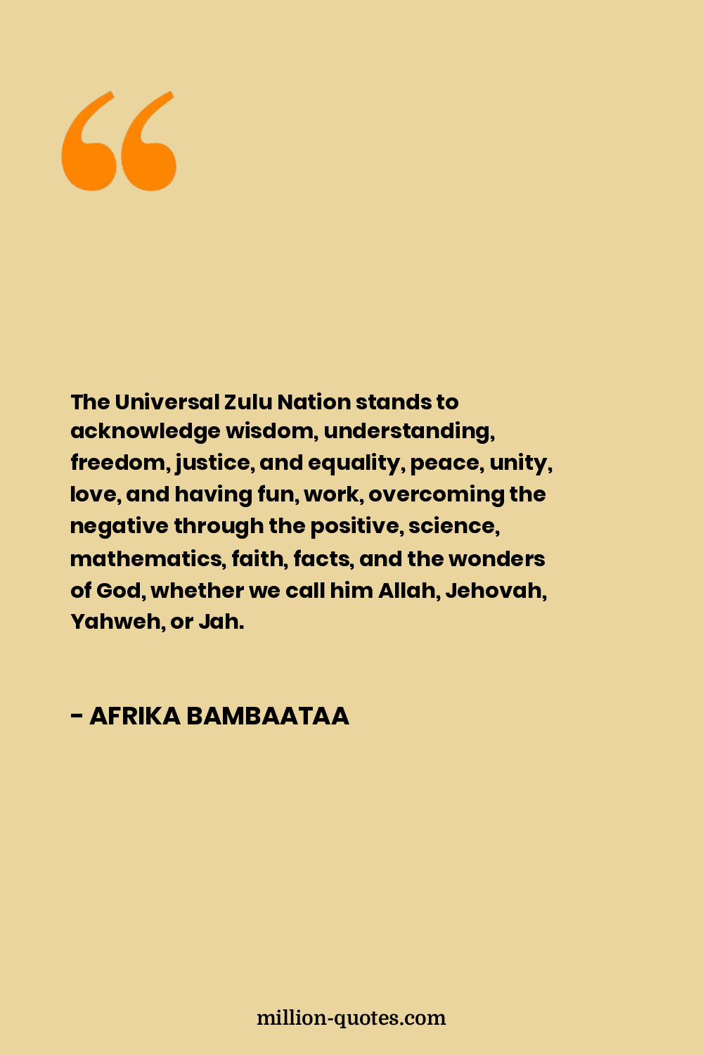 The Universal Zulu Nation stands to acknowledge wisdom, understanding, freedom, justice, and equality, peace, unity, love, and having fun, work, overcoming the negative through the positive, science, mathematics, faith, facts, and the wonders of God, whether we call him Allah, Jehovah, Yahweh, or Jah.