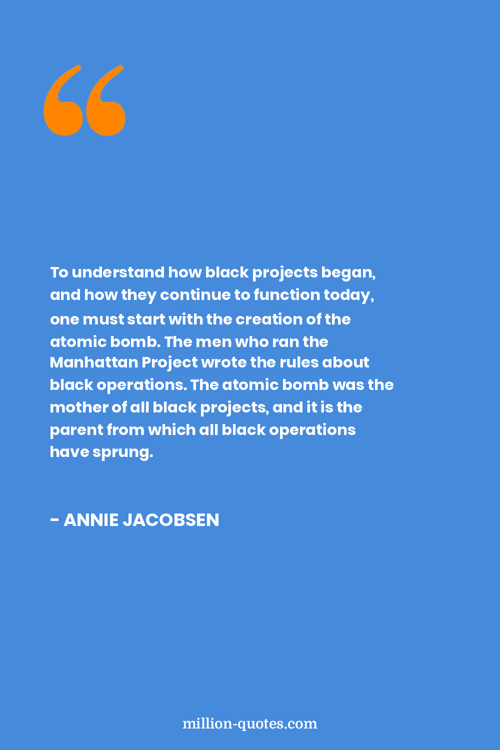 To understand how black projects began, and how they continue to function today, one must start with the creation of the atomic bomb. The men who ran the Manhattan Project wrote the rules about black operations. The atomic bomb was the mother of all black projects, and it is the parent from which all black operations have sprung.