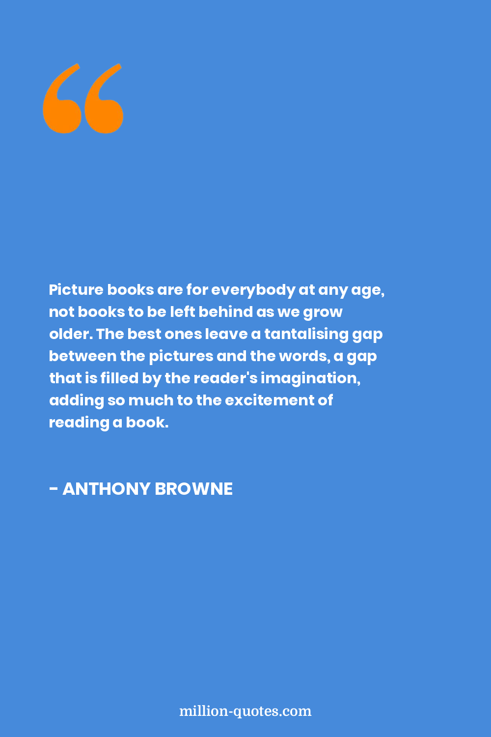 Picture books are for everybody at any age, not books to be left behind as we grow older. The best ones leave a tantalising gap between the pictures and the words, a gap that is filled by the reader's imagination, adding so much to the excitement of reading a book.