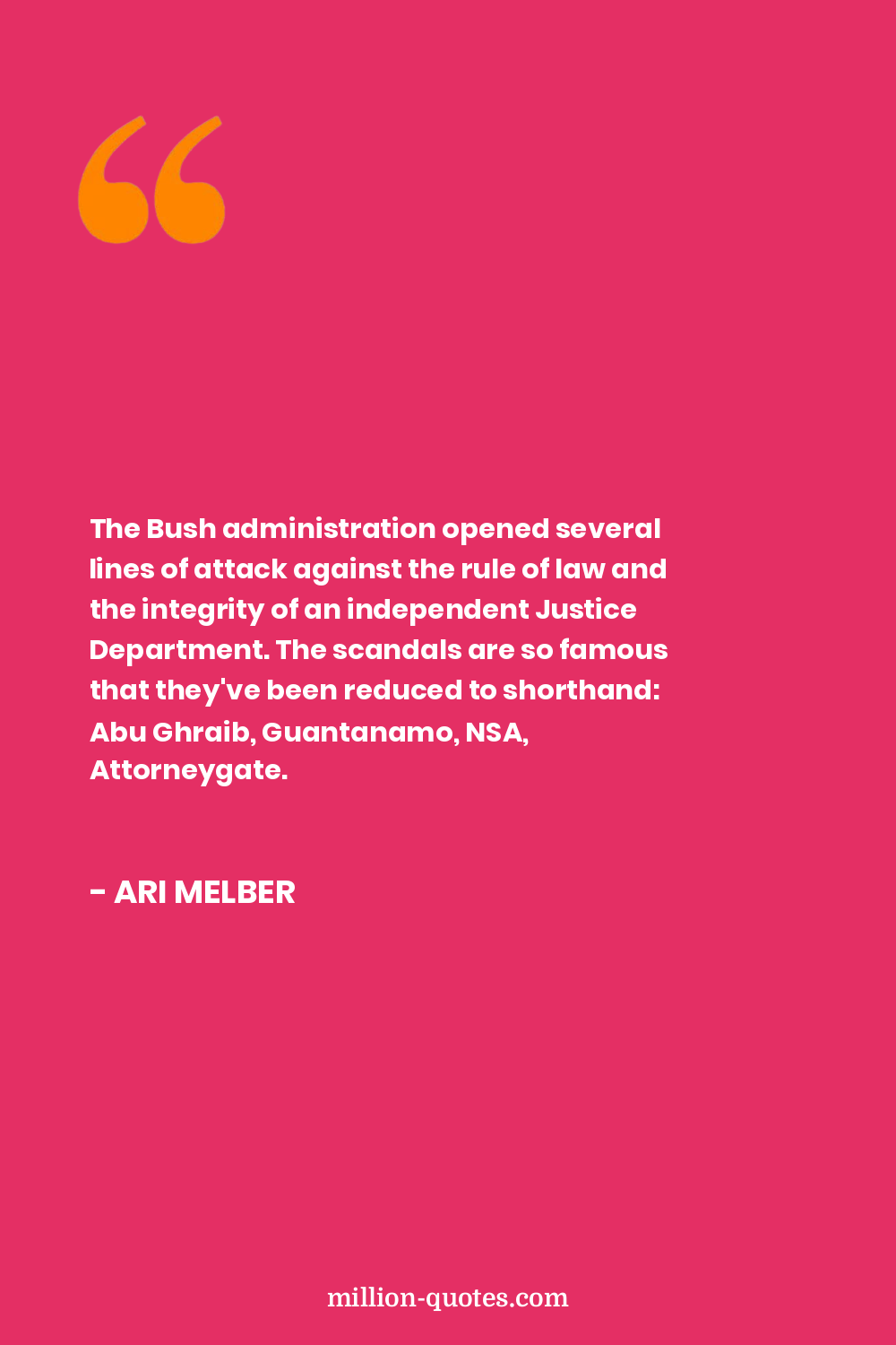 The Bush administration opened several lines of attack against the rule of law and the integrity of an independent Justice Department. The scandals are so famous that they've been reduced to shorthand: Abu Ghraib, Guantanamo, NSA, Attorneygate.