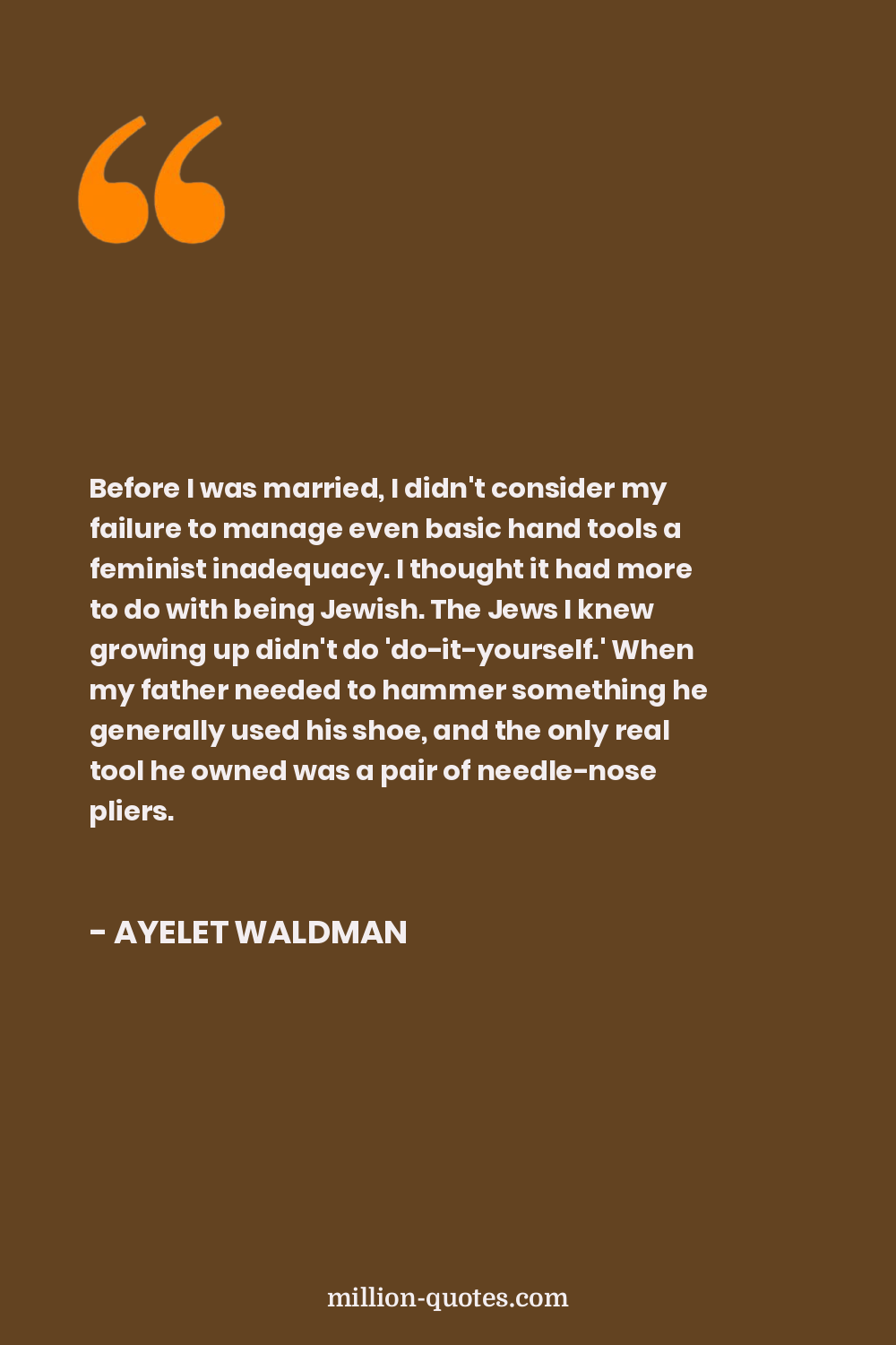 Before I was married, I didn't consider my failure to manage even basic hand tools a feminist inadequacy. I thought it had more to do with being Jewish. The Jews I knew growing up didn't do 'do-it-yourself.' When my father needed to hammer something he generally used his shoe, and the only real tool he owned was a pair of needle-nose pliers.
