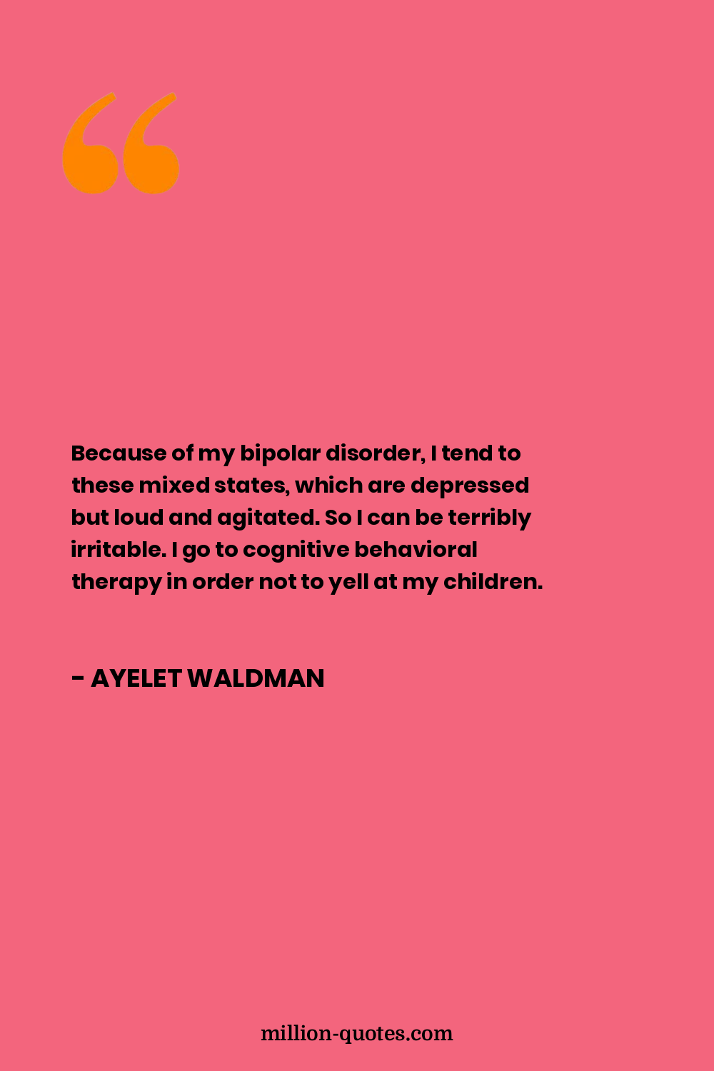 Because of my bipolar disorder, I tend to these mixed states, which are depressed but loud and agitated. So I can be terribly irritable. I go to cognitive behavioral therapy in order not to yell at my children.