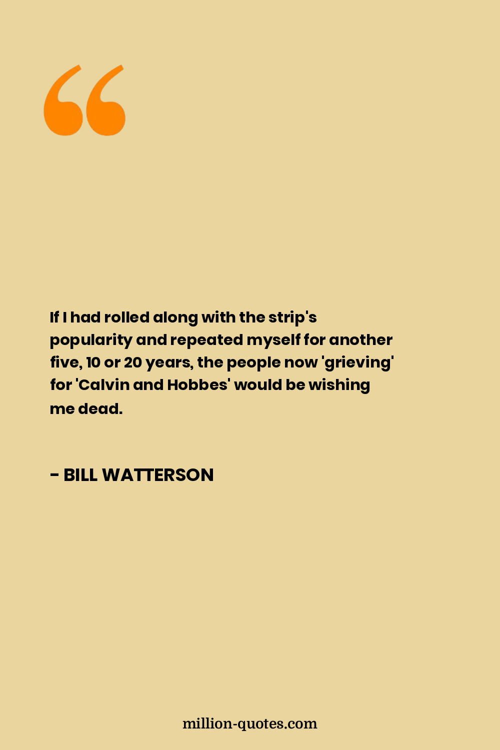 If I had rolled along with the strip's popularity and repeated myself for another five, 10 or 20 years, the people now 'grieving' for 'Calvin and Hobbes' would be wishing me dead.