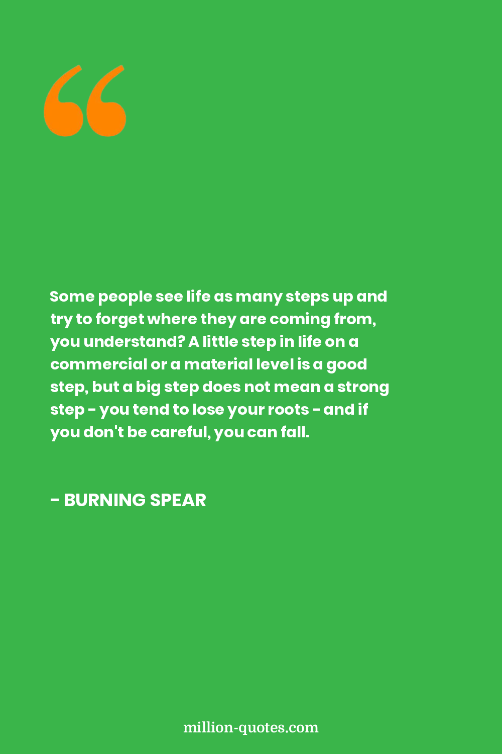 Beberapa orang melihat kehidupan sebagai langkah maju dan mencoba melupakan dari mana mereka berasal, Anda mengerti? Sedikit langkah dalam kehidupan pada tingkat komersial atau materi adalah langkah yang baik, tetapi langkah besar tidak berarti langkah yang kuat - Anda cenderung kehilangan akar - dan jika Anda tidak hati-hati, Anda bisa jatuh.