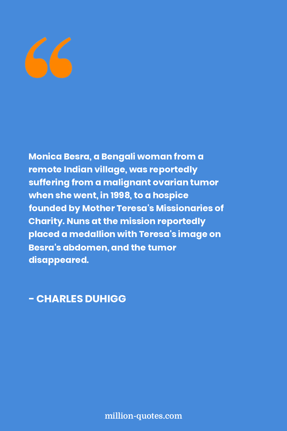 Monica Besra, a Bengali woman from a remote Indian village, was reportedly suffering from a malignant ovarian tumor when she went, in 1998, to a hospice founded by Mother Teresa's Missionaries of Charity. Nuns at the mission reportedly placed a medallion with Teresa's image on Besra's abdomen, and the tumor disappeared.