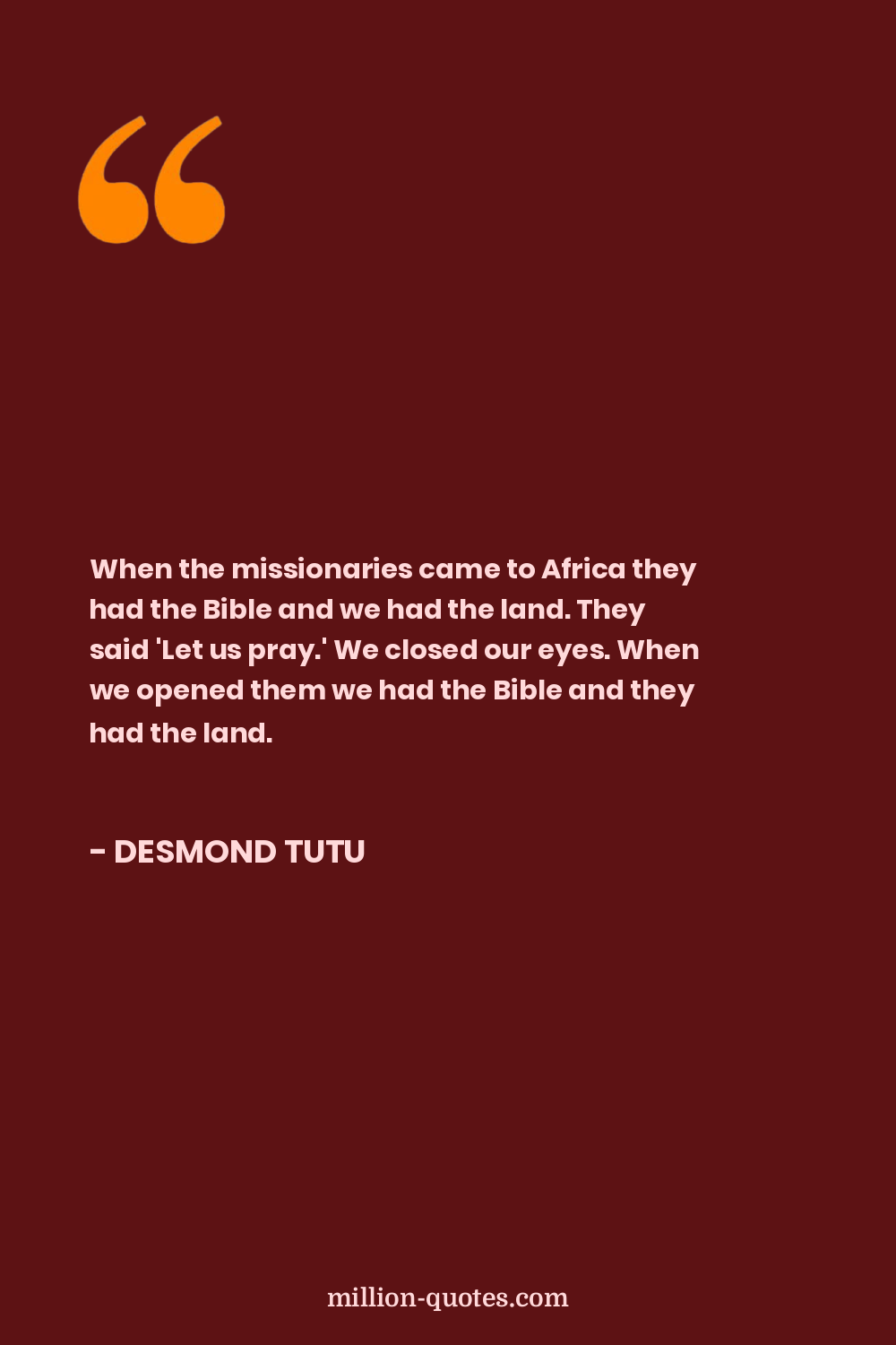 When the missionaries came to Africa they had the Bible and we had the land. They said 'Let us pray.' We closed our eyes. When we opened them we had the Bible and they had the land.