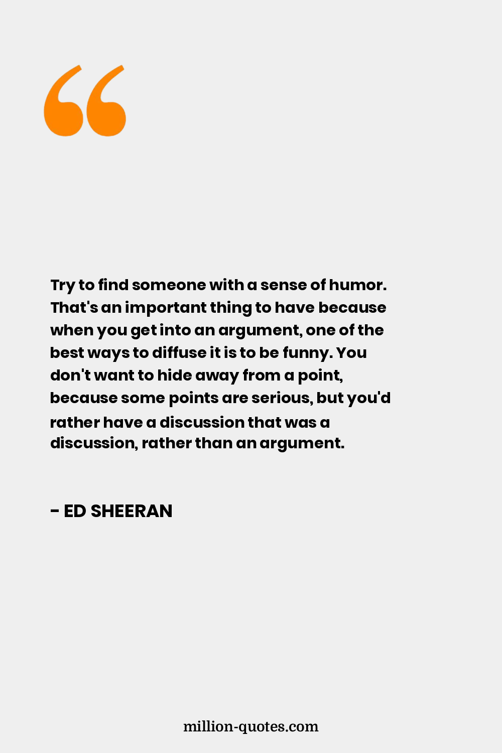 Try to find someone with a sense of humor. That's an important thing to have because when you get into an argument, one of the best ways to diffuse it is to be funny. You don't want to hide away from a point, because some points are serious, but you'd rather have a discussion that was a discussion, rather than an argument.