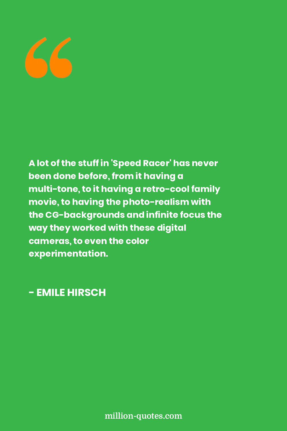 A lot of the stuff in 'Speed Racer' has never been done before, from it having a multi-tone, to it having a retro-cool family movie, to having the photo-realism with the CG-backgrounds and infinite focus the way they worked with these digital cameras, to even the color experimentation.
