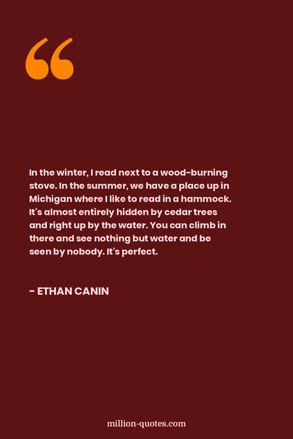 In the winter, I read next to a wood-burning stove. In the summer, we have a place up in Michigan where I like to read in a hammock. It's almost entirely hidden by cedar trees and right up by the water. You can climb in there and see nothing but water and be seen by nobody. It's perfect.