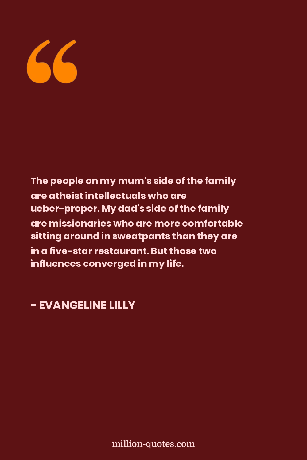 The people on my mum's side of the family are atheist intellectuals who are ueber-proper. My dad's side of the family are missionaries who are more comfortable sitting around in sweatpants than they are in a five-star restaurant. But those two influences converged in my life.