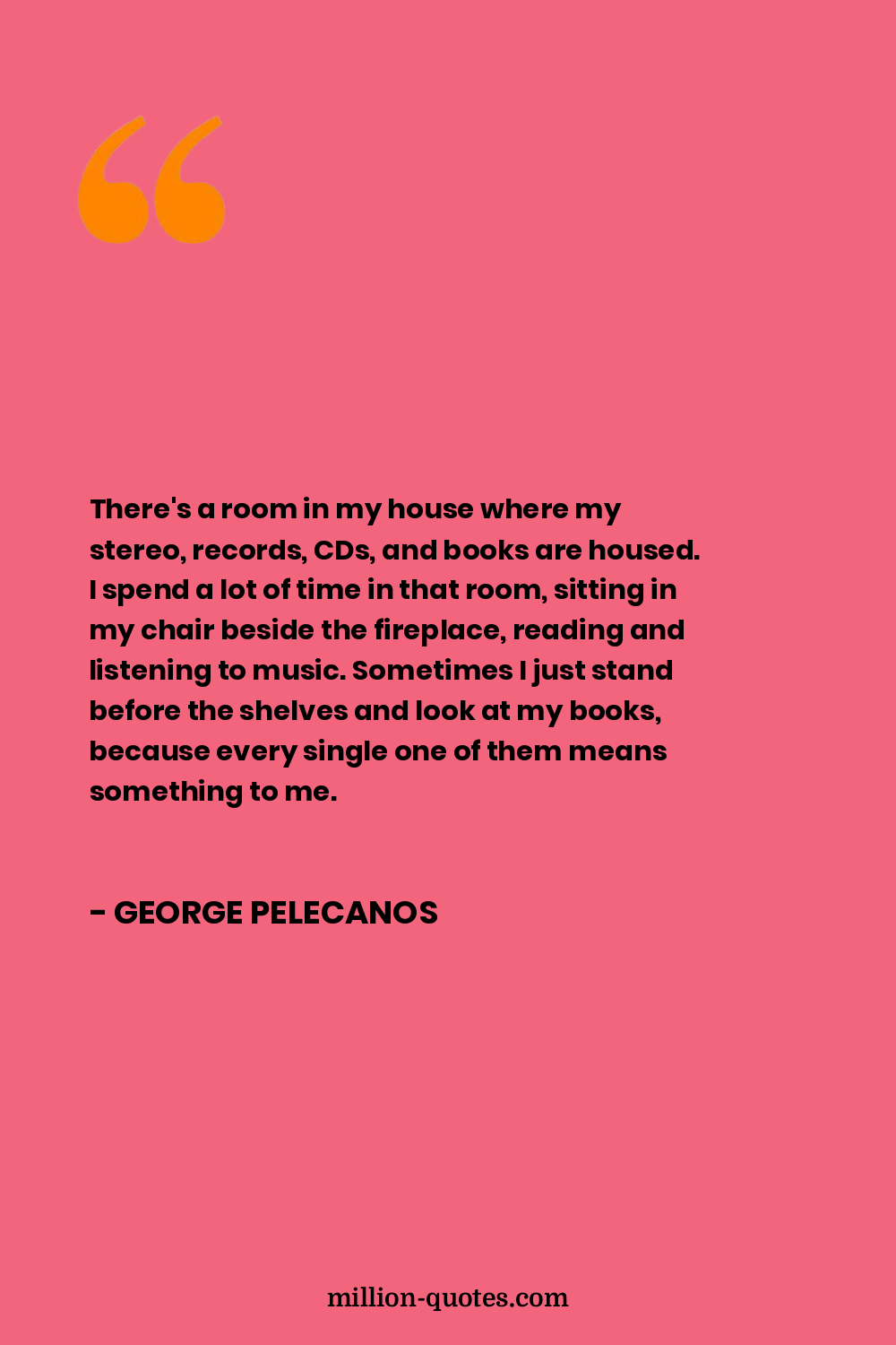 There's a room in my house where my stereo, records, CDs, and books are housed. I spend a lot of time in that room, sitting in my chair beside the fireplace, reading and listening to music. Sometimes I just stand before the shelves and look at my books, because every single one of them means something to me.