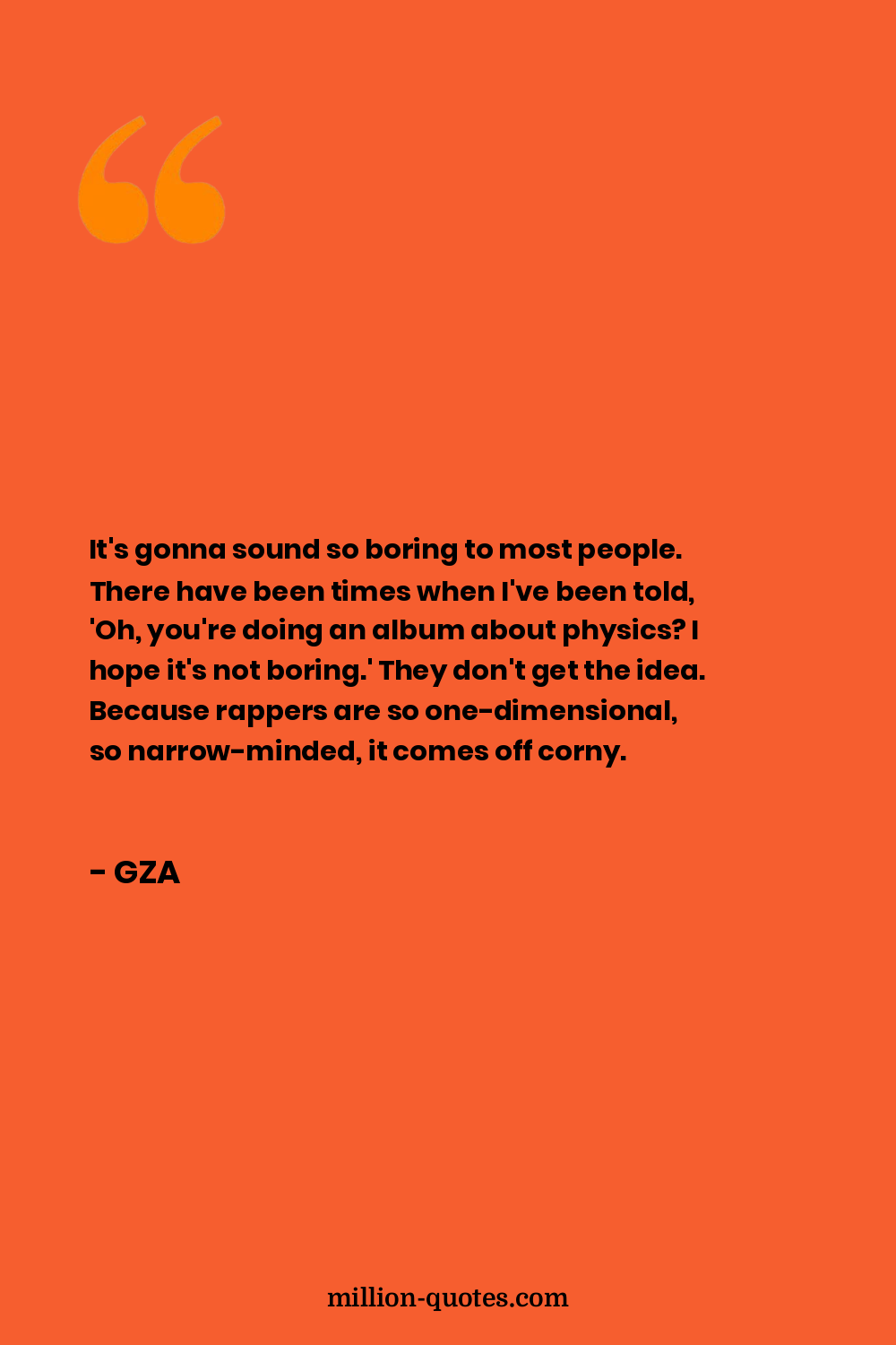 It's gonna sound so boring to most people. There have been times when I've been told, 'Oh, you're doing an album about physics? I hope it's not boring.' They don't get the idea. Because rappers are so one-dimensional, so narrow-minded, it comes off corny.