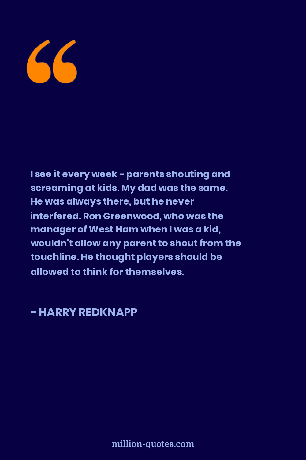 I see it every week - parents shouting and screaming at kids. My dad was the same. He was always there, but he never interfered. Ron Greenwood, who was the manager of West Ham when I was a kid, wouldn't allow any parent to shout from the touchline. He thought players should be allowed to think for themselves.
