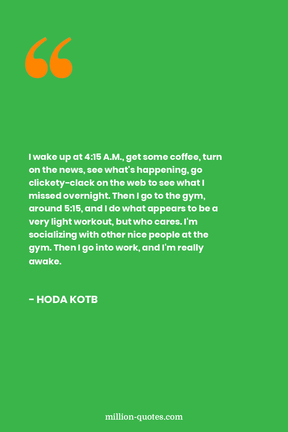 I wake up at 4:15 A.M., get some coffee, turn on the news, see what's happening, go clickety-clack on the web to see what I missed overnight. Then I go to the gym, around 5:15, and I do what appears to be a very light workout, but who cares. I'm socializing with other nice people at the gym. Then I go into work, and I'm really awake.