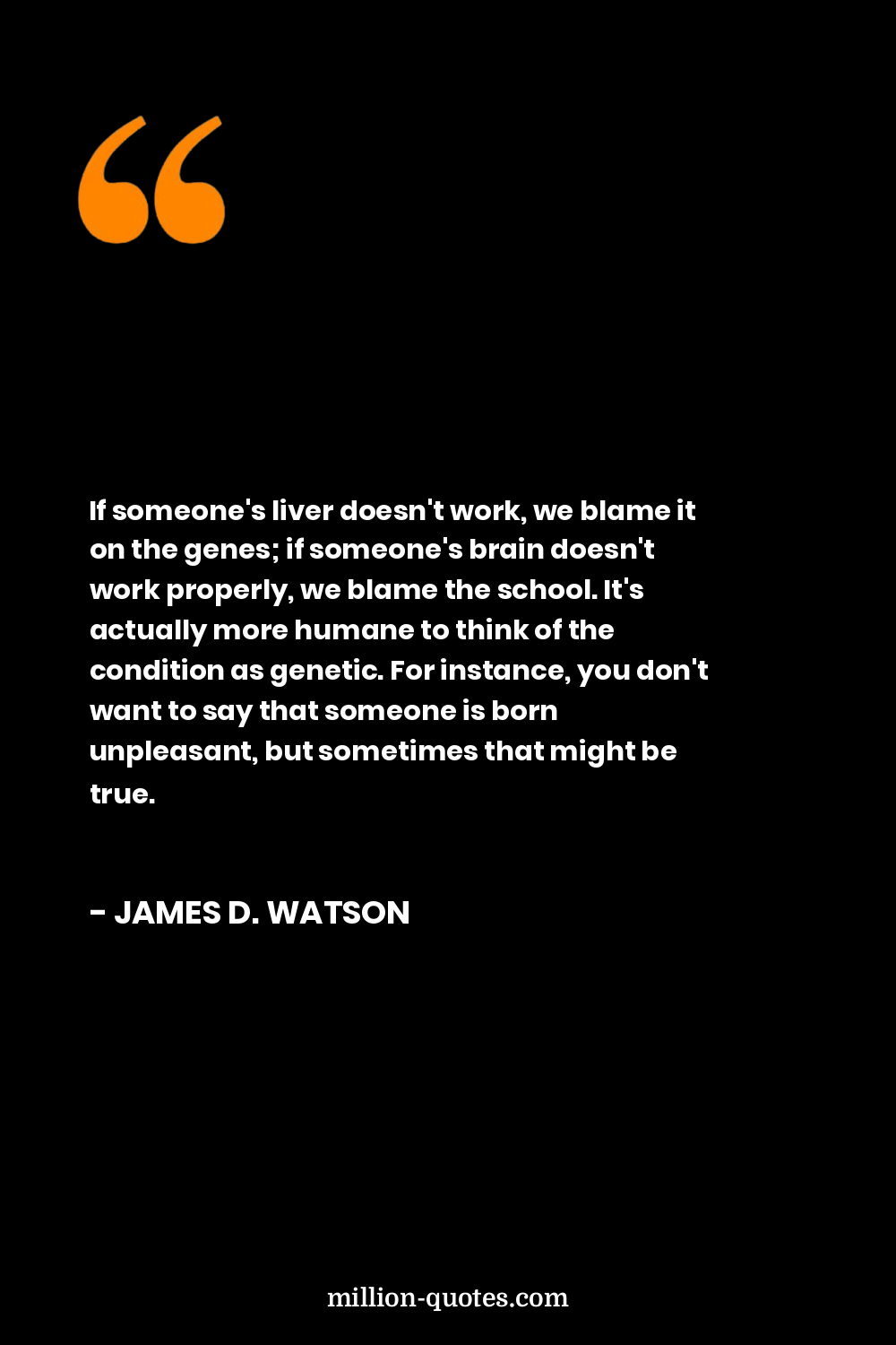 If someone's liver doesn't work, we blame it on the genes; if someone's brain doesn't work properly, we blame the school. It's actually more humane to think of the condition as genetic. For instance, you don't want to say that someone is born unpleasant, but sometimes that might be true.
