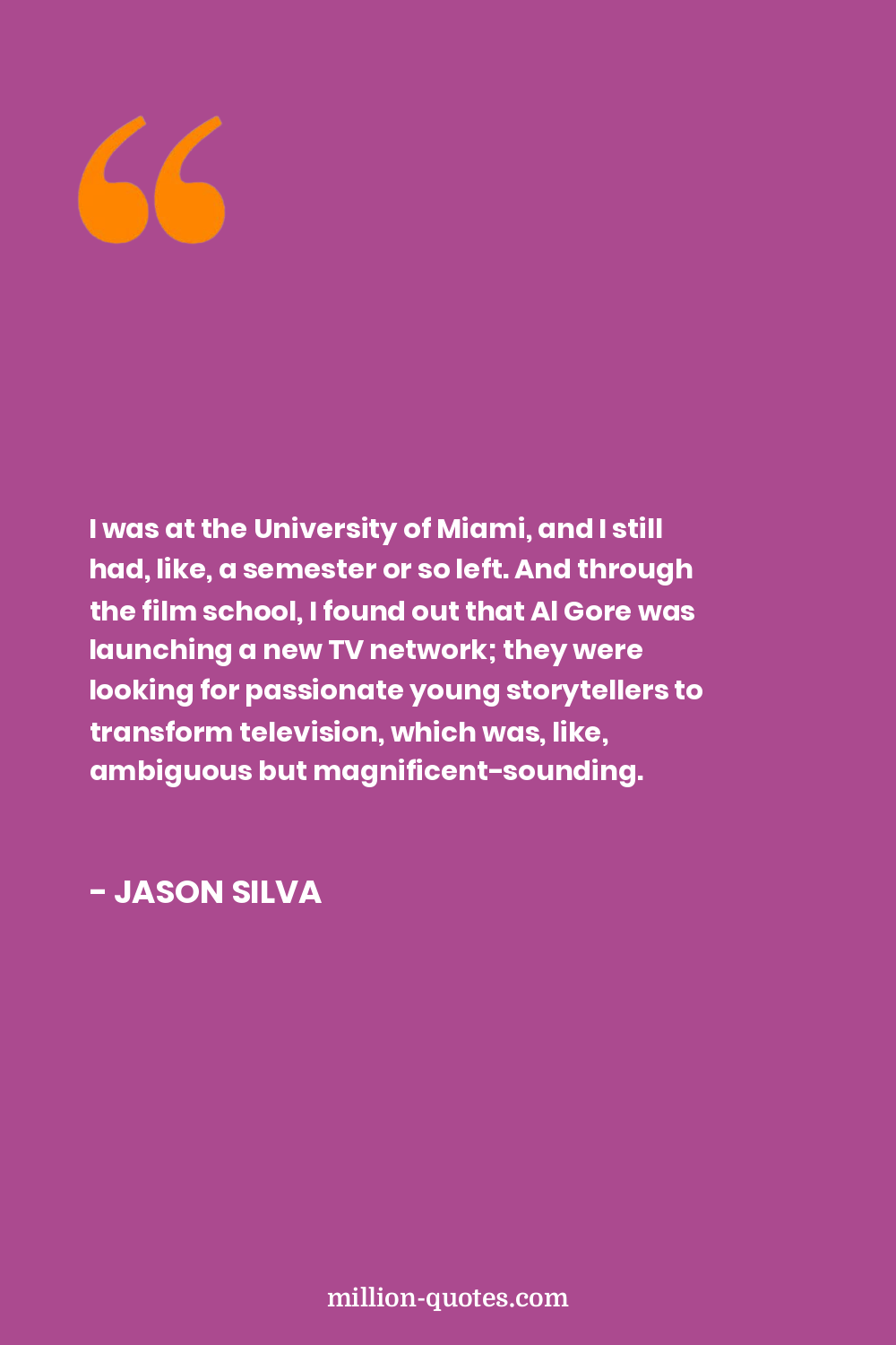 I was at the University of Miami, and I still had, like, a semester or so left. And through the film school, I found out that Al Gore was launching a new TV network; they were looking for passionate young storytellers to transform television, which was, like, ambiguous but magnificent-sounding.