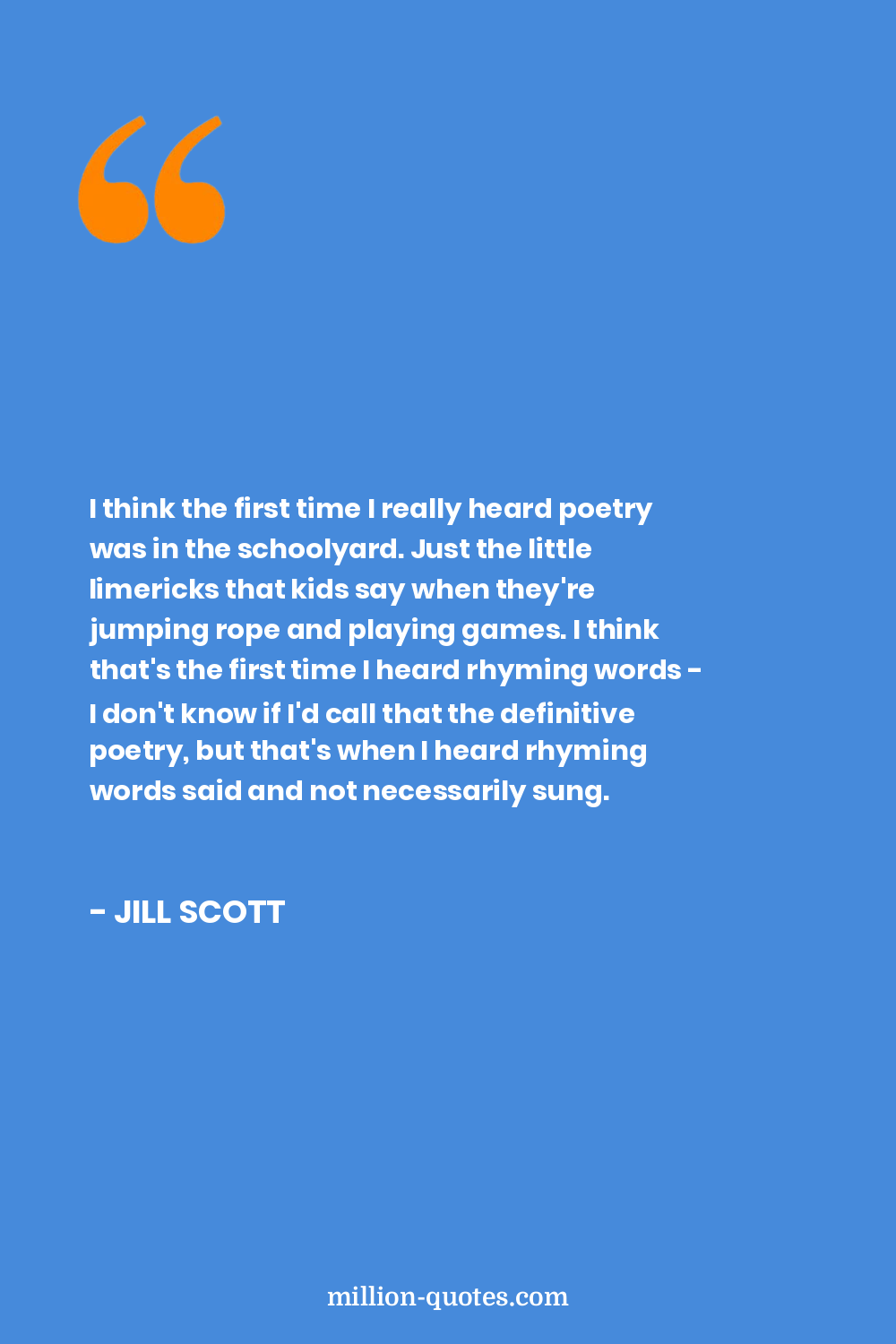 I think the first time I really heard poetry was in the schoolyard. Just the little limericks that kids say when they're jumping rope and playing games. I think that's the first time I heard rhyming words - I don't know if I'd call that the definitive poetry, but that's when I heard rhyming words said and not necessarily sung.
