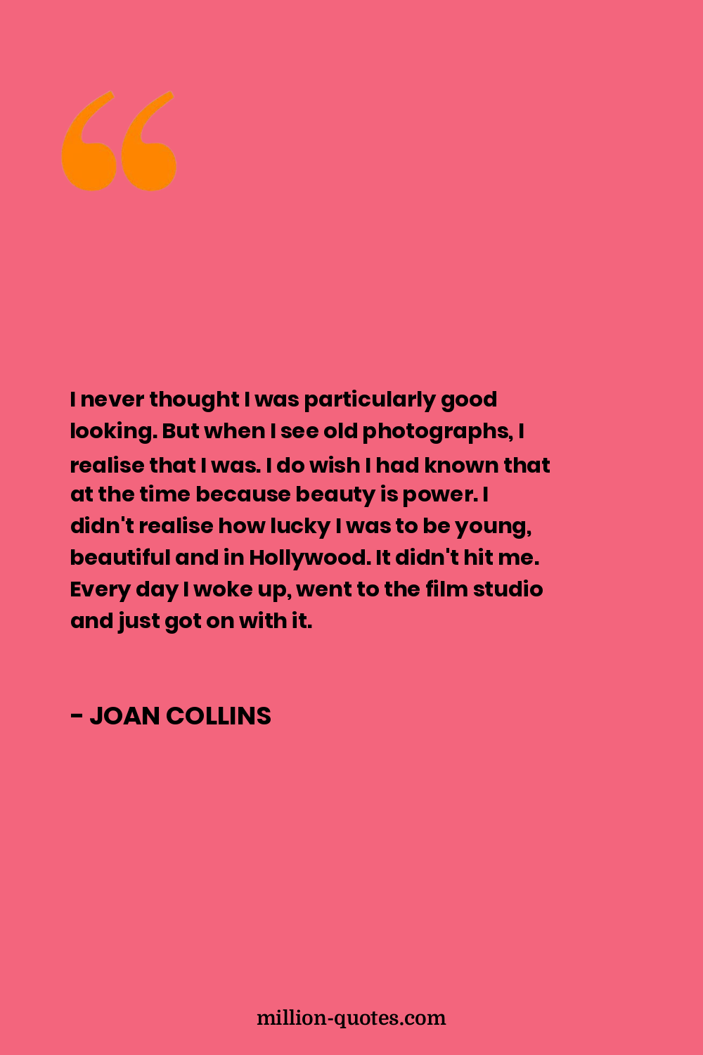 I never thought I was particularly good looking. But when I see old photographs, I realise that I was. I do wish I had known that at the time because beauty is power. I didn't realise how lucky I was to be young, beautiful and in Hollywood. It didn't hit me. Every day I woke up, went to the film studio and just got on with it.