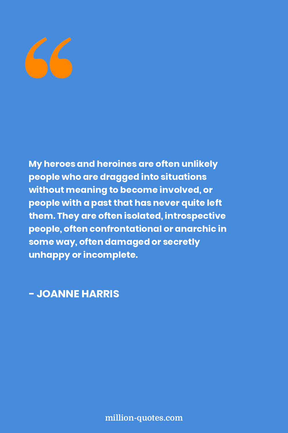 My heroes and heroines are often unlikely people who are dragged into situations without meaning to become involved, or people with a past that has never quite left them. They are often isolated, introspective people, often confrontational or anarchic in some way, often damaged or secretly unhappy or incomplete.