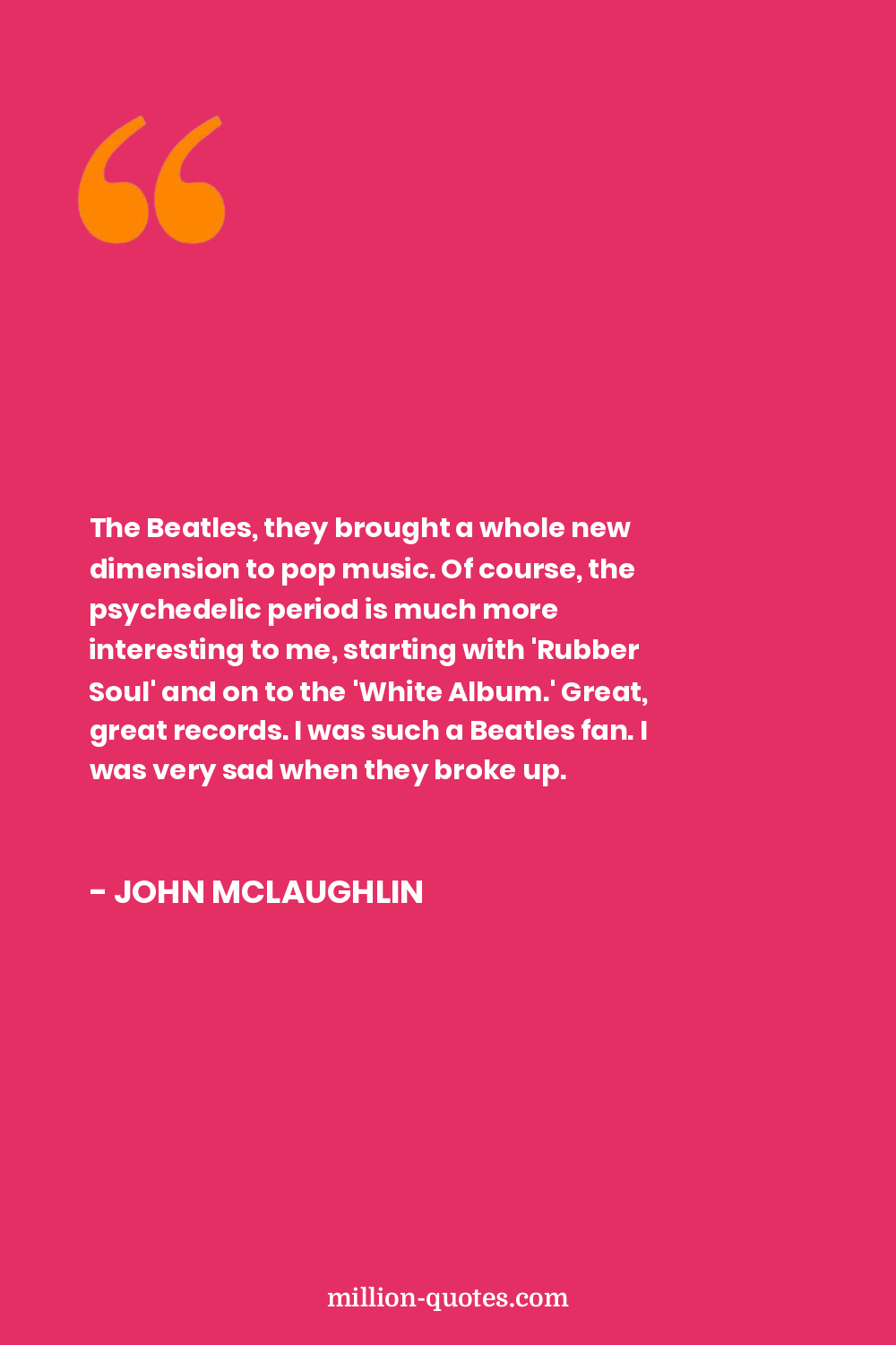 The Beatles, they brought a whole new dimension to pop music. Of course, the psychedelic period is much more interesting to me, starting with 'Rubber Soul' and on to the 'White Album.' Great, great records. I was such a Beatles fan. I was very sad when they broke up.