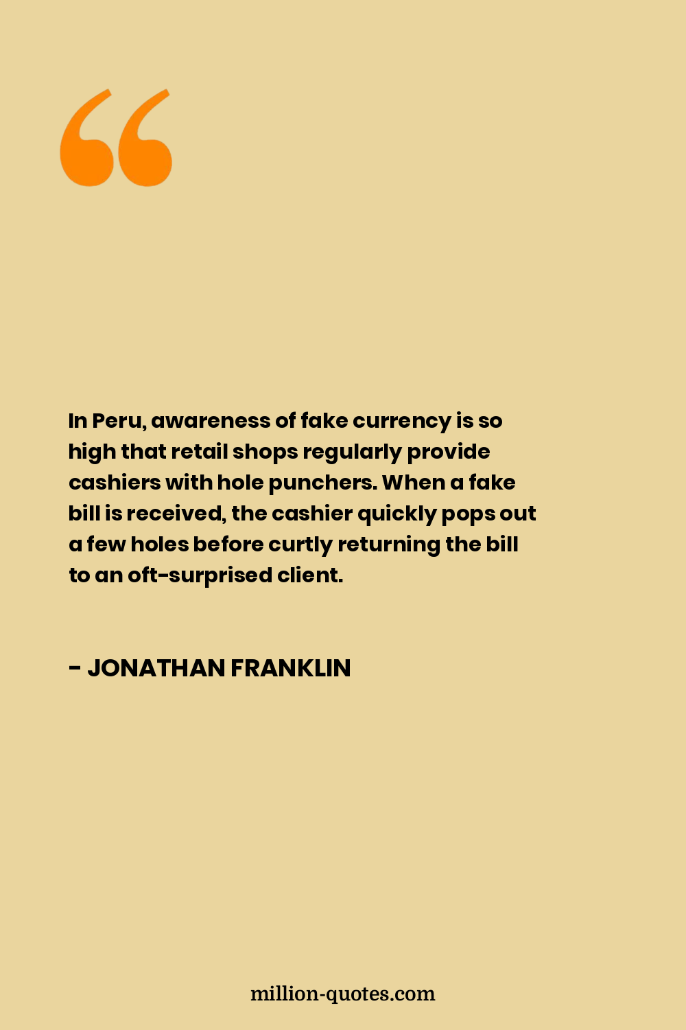 In Peru, awareness of fake currency is so high that retail shops regularly provide cashiers with hole punchers. When a fake bill is received, the cashier quickly pops out a few holes before curtly returning the bill to an oft-surprised client.