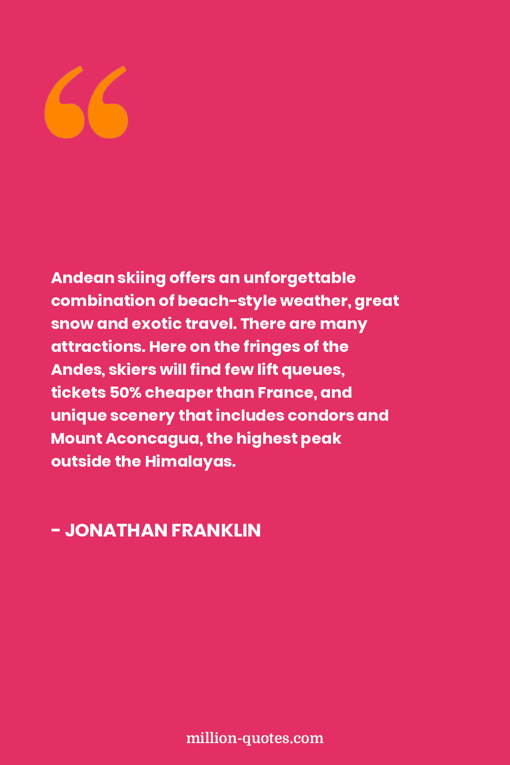 Andean skiing offers an unforgettable combination of beach-style weather, great snow and exotic travel. There are many attractions. Here on the fringes of the Andes, skiers will find few lift queues, tickets 50% cheaper than France, and unique scenery that includes condors and Mount Aconcagua, the highest peak outside the Himalayas.