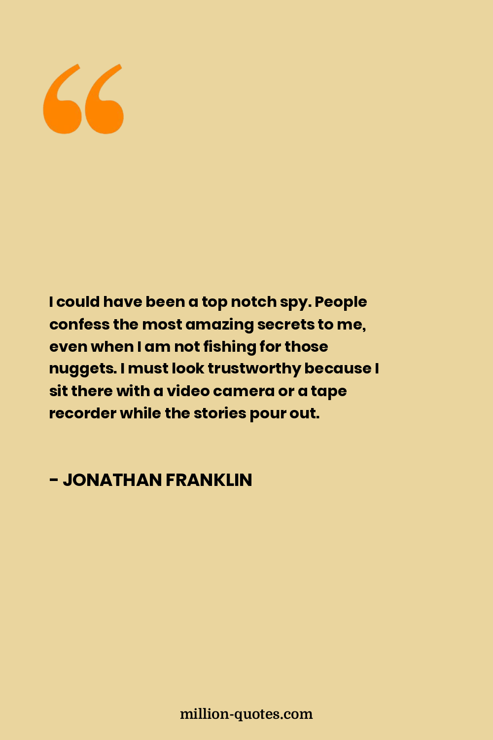 I could have been a top notch spy. People confess the most amazing secrets to me, even when I am not fishing for those nuggets. I must look trustworthy because I sit there with a video camera or a tape recorder while the stories pour out.
