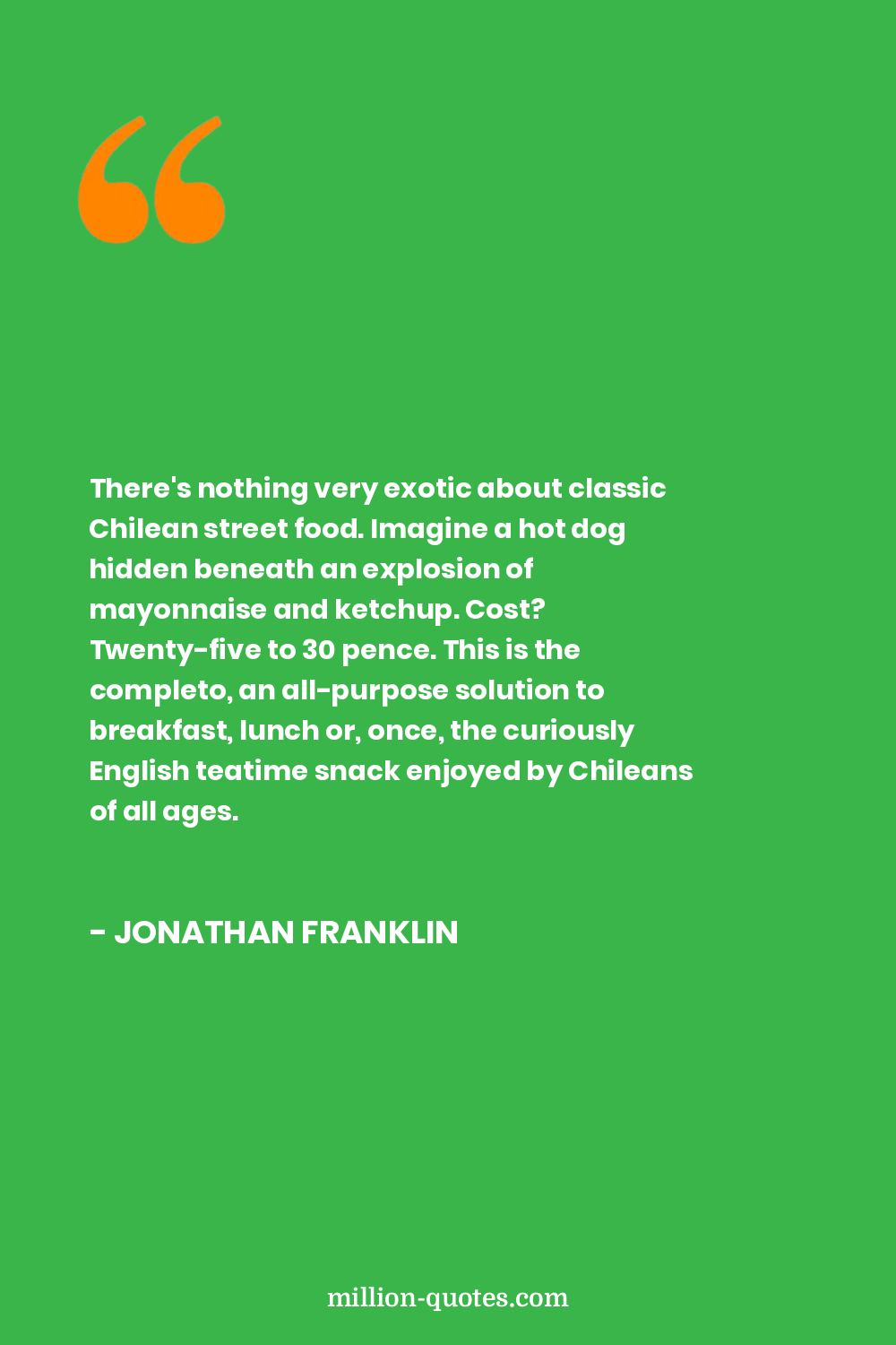There's nothing very exotic about classic Chilean street food. Imagine a hot dog hidden beneath an explosion of mayonnaise and ketchup. Cost? Twenty-five to 30 pence. This is the completo, an all-purpose solution to breakfast, lunch or, once, the curiously English teatime snack enjoyed by Chileans of all ages.