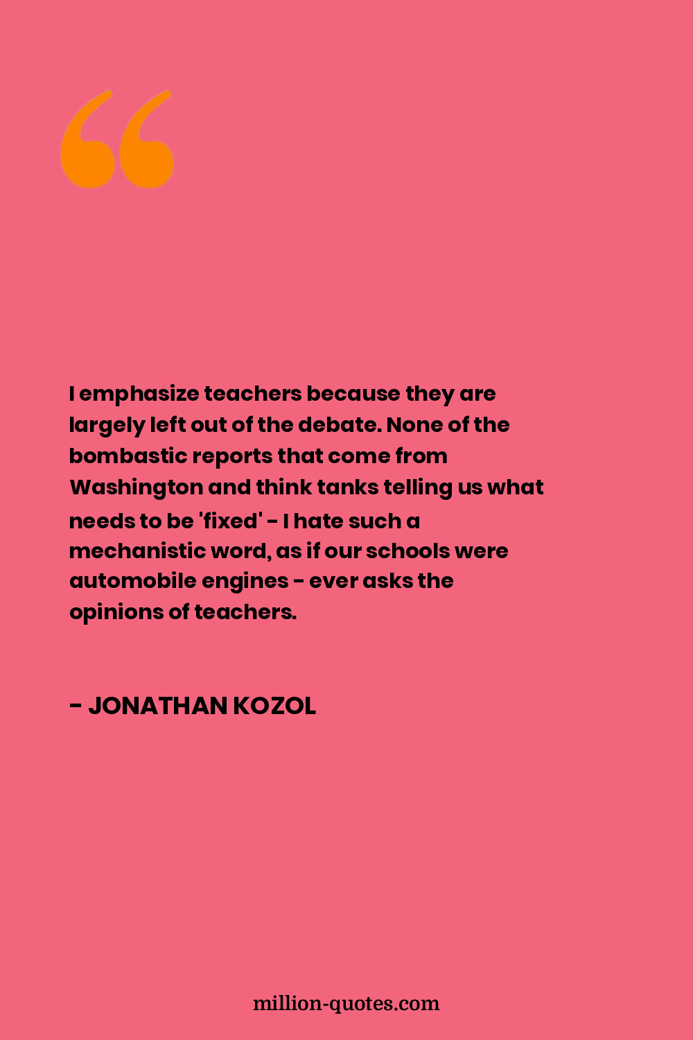 I emphasize teachers because they are largely left out of the debate. None of the bombastic reports that come from Washington and think tanks telling us what needs to be 'fixed' - I hate such a mechanistic word, as if our schools were automobile engines - ever asks the opinions of teachers.