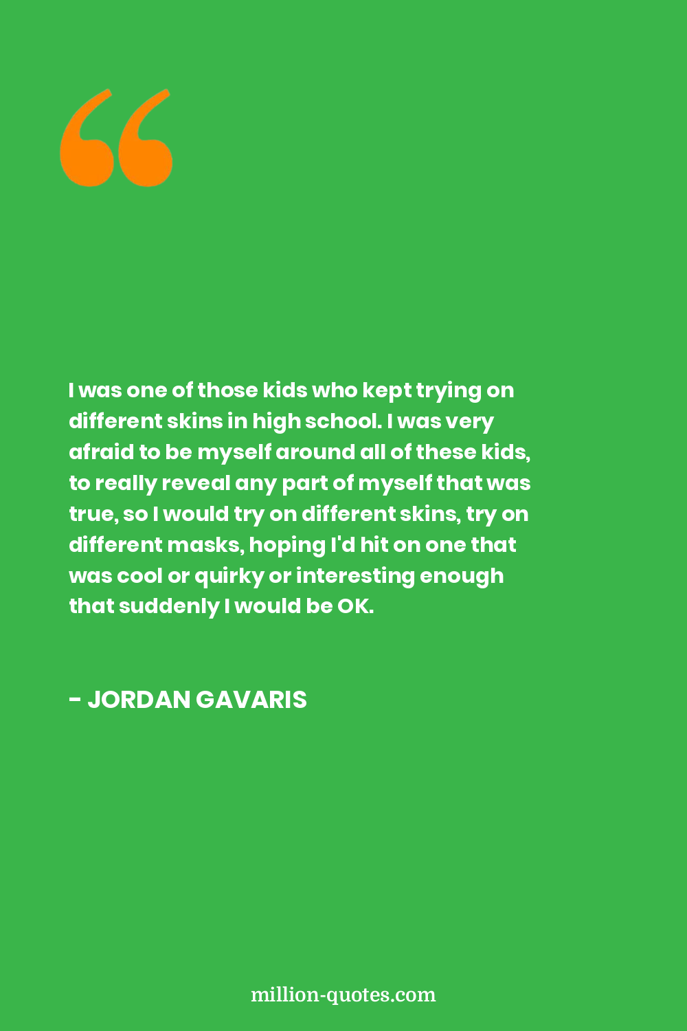 I was one of those kids who kept trying on different skins in high school. I was very afraid to be myself around all of these kids, to really reveal any part of myself that was true, so I would try on different skins, try on different masks, hoping I'd hit on one that was cool or quirky or interesting enough that suddenly I would be OK.