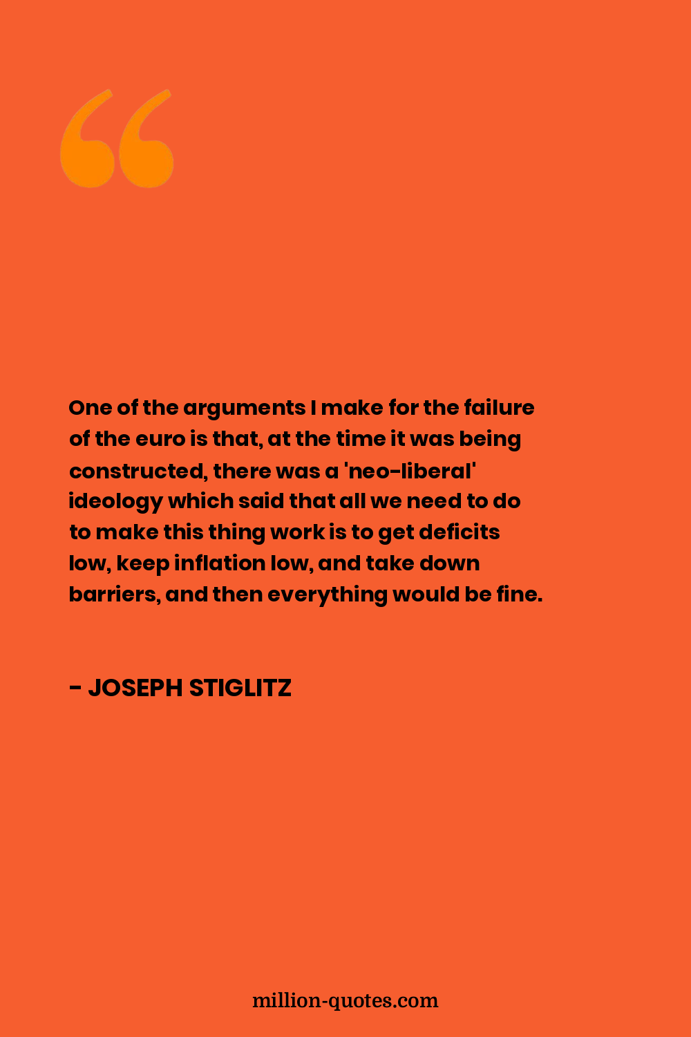 One of the arguments I make for the failure of the euro is that, at the time it was being constructed, there was a 'neo-liberal' ideology which said that all we need to do to make this thing work is to get deficits low, keep inflation low, and take down barriers, and then everything would be fine.