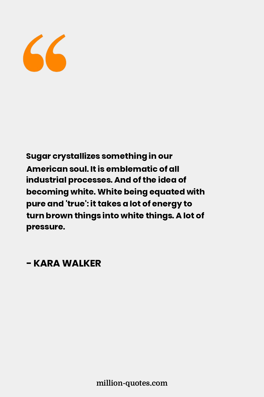 Sugar crystallizes something in our American soul. It is emblematic of all industrial processes. And of the idea of becoming white. White being equated with pure and 'true': it takes a lot of energy to turn brown things into white things. A lot of pressure.