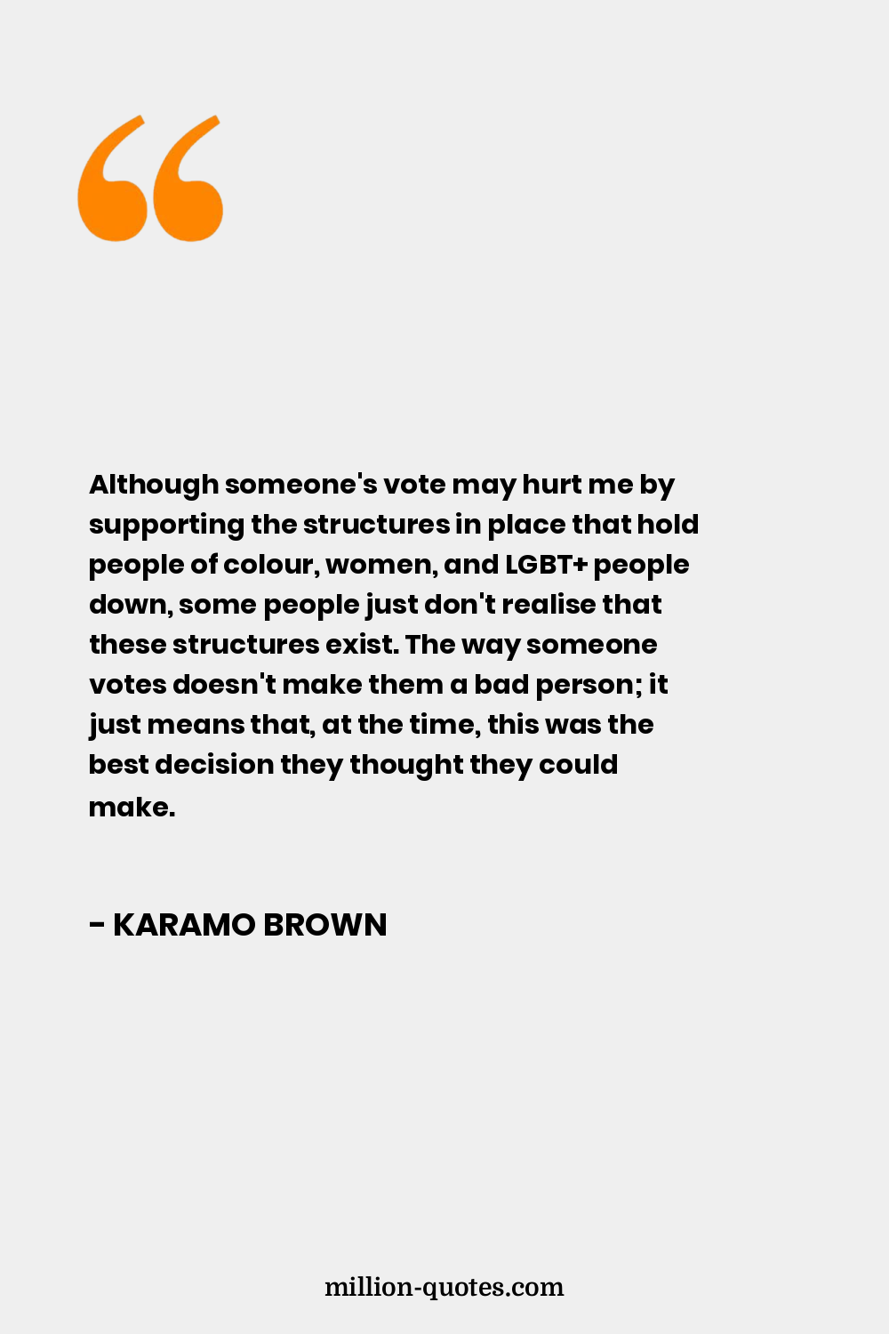 Although someone's vote may hurt me by supporting the structures in place that hold people of colour, women, and LGBT+ people down, some people just don't realise that these structures exist. The way someone votes doesn't make them a bad person; it just means that, at the time, this was the best decision they thought they could make.