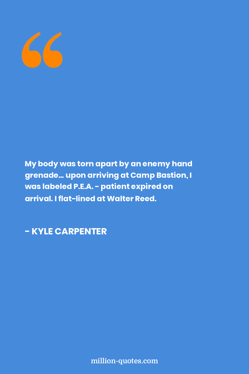 My body was torn apart by an enemy hand grenade... upon arriving at Camp Bastion, I was labeled P.E.A. - patient expired on arrival. I flat-lined at Walter Reed.