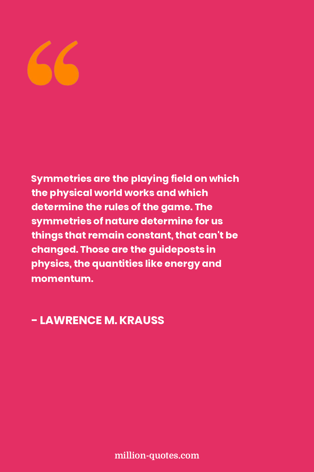 Symmetries are the playing field on which the physical world works and which determine the rules of the game. The symmetries of nature determine for us things that remain constant, that can't be changed. Those are the guideposts in physics, the quantities like energy and momentum.