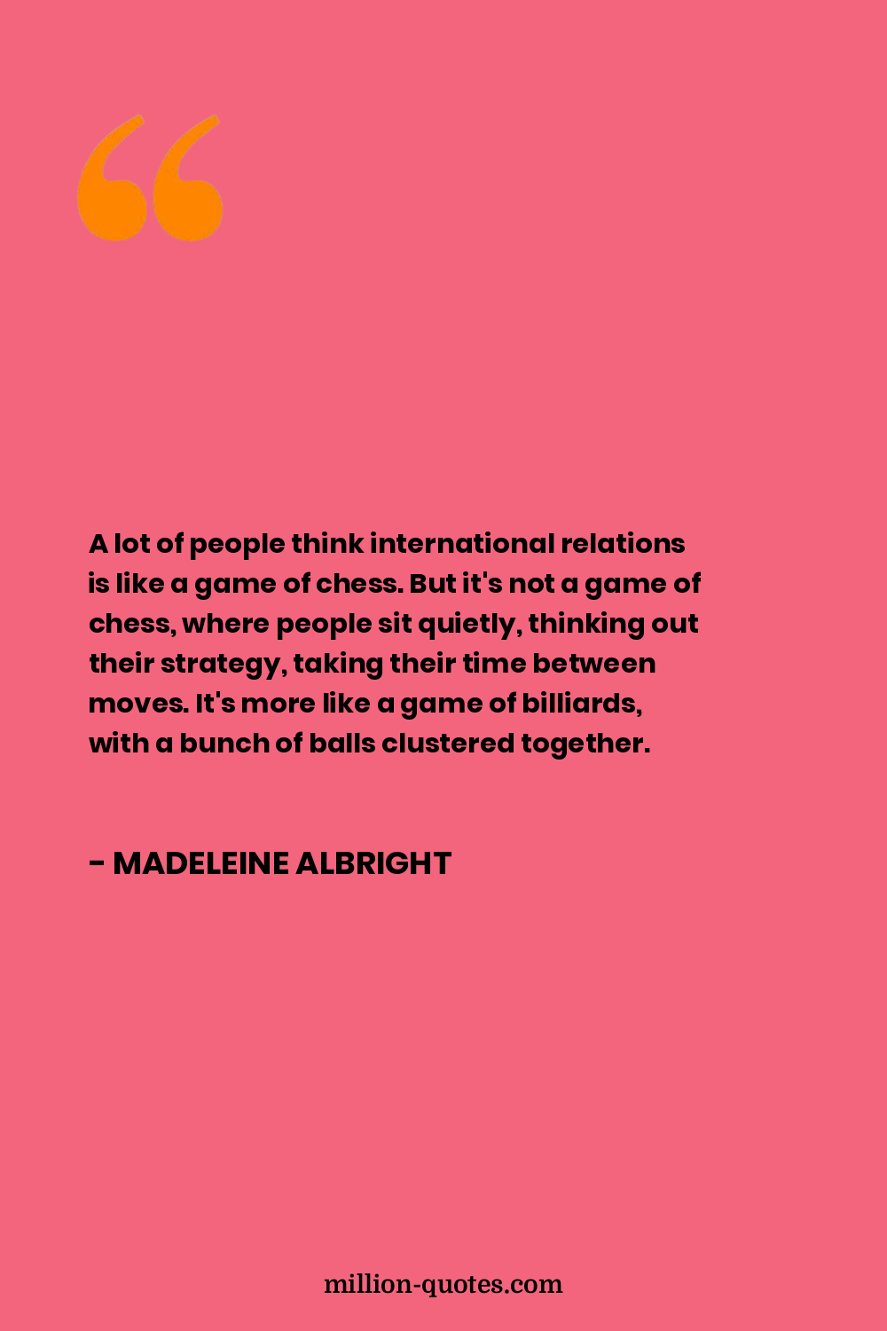 A lot of people think international relations is like a game of chess. But it's not a game of chess, where people sit quietly, thinking out their strategy, taking their time between moves. It's more like a game of billiards, with a bunch of balls clustered together.