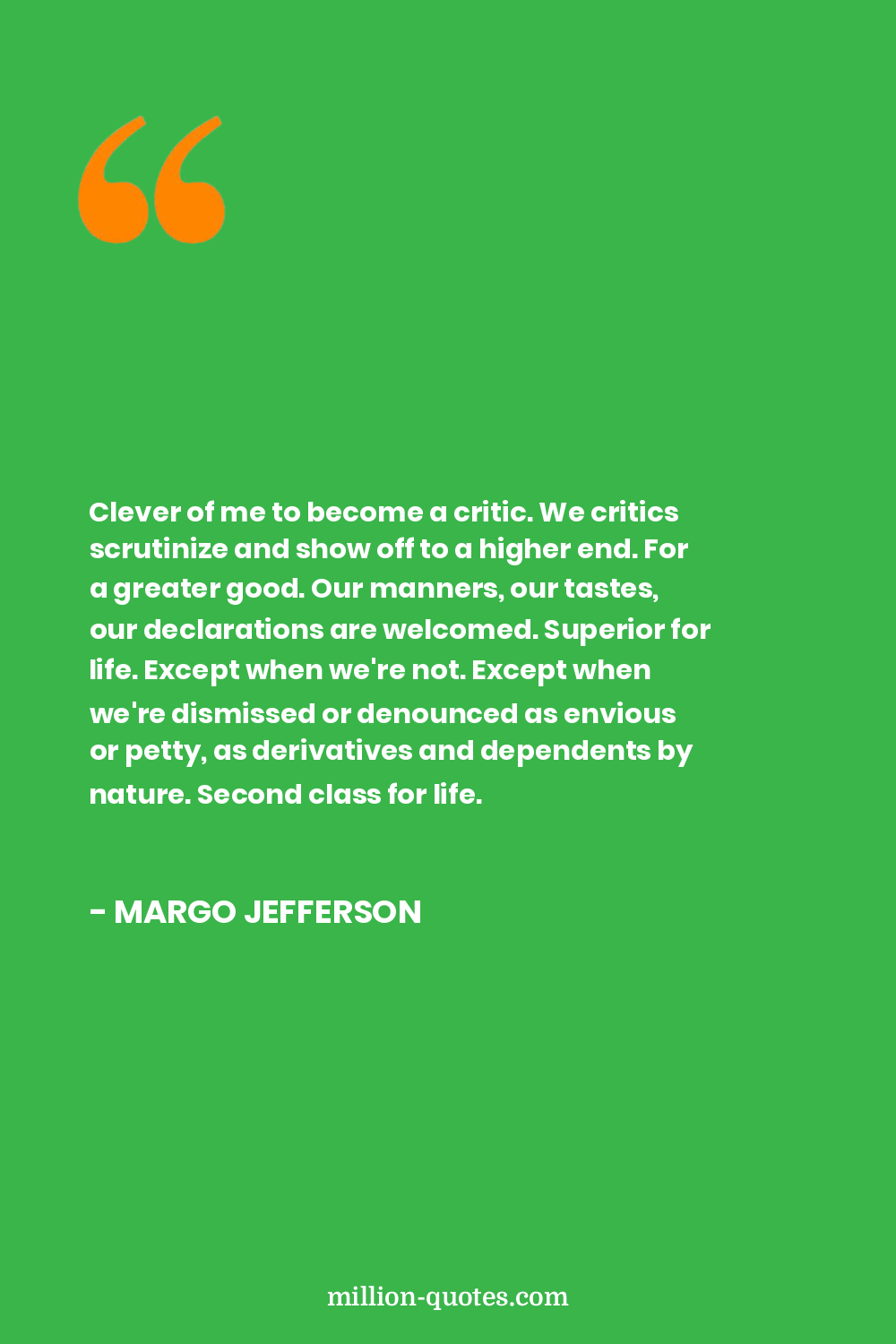 Clever of me to become a critic. We critics scrutinize and show off to a higher end. For a greater good. Our manners, our tastes, our declarations are welcomed. Superior for life. Except when we're not. Except when we're dismissed or denounced as envious or petty, as derivatives and dependents by nature. Second class for life.