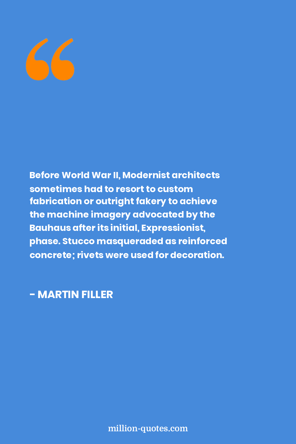 Before World War II, Modernist architects sometimes had to resort to custom fabrication or outright fakery to achieve the machine imagery advocated by the Bauhaus after its initial, Expressionist, phase. Stucco masqueraded as reinforced concrete; rivets were used for decoration.