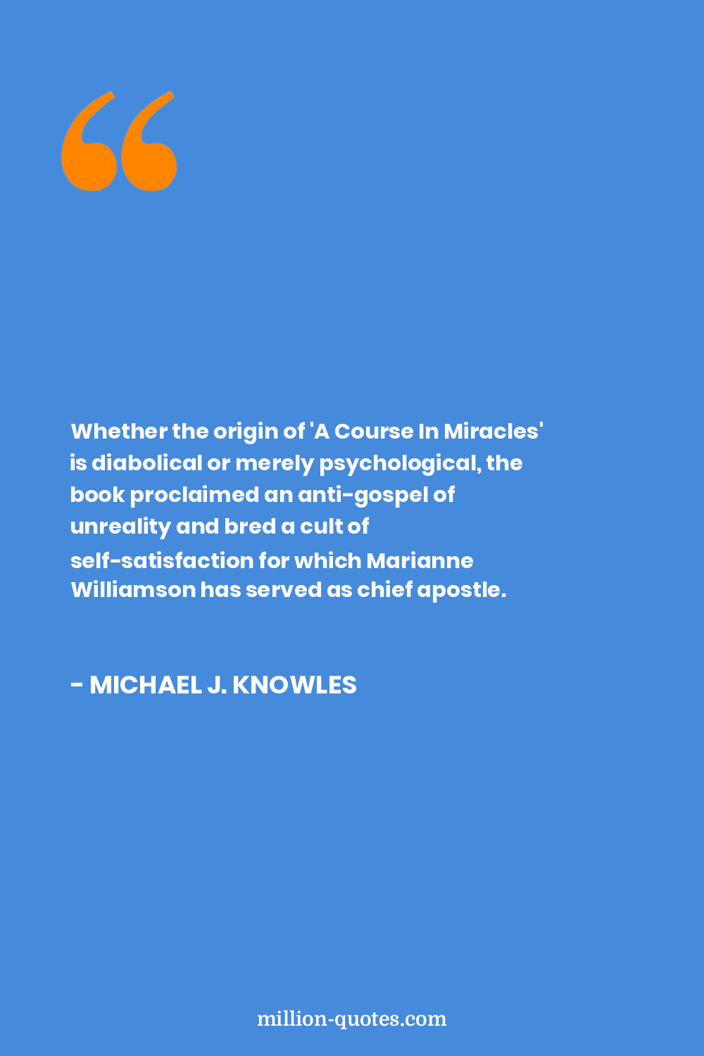 Whether the origin of 'A Course In Miracles' is diabolical or merely psychological, the book proclaimed an anti-gospel of unreality and bred a cult of self-satisfaction for which Marianne Williamson has served as chief apostle.