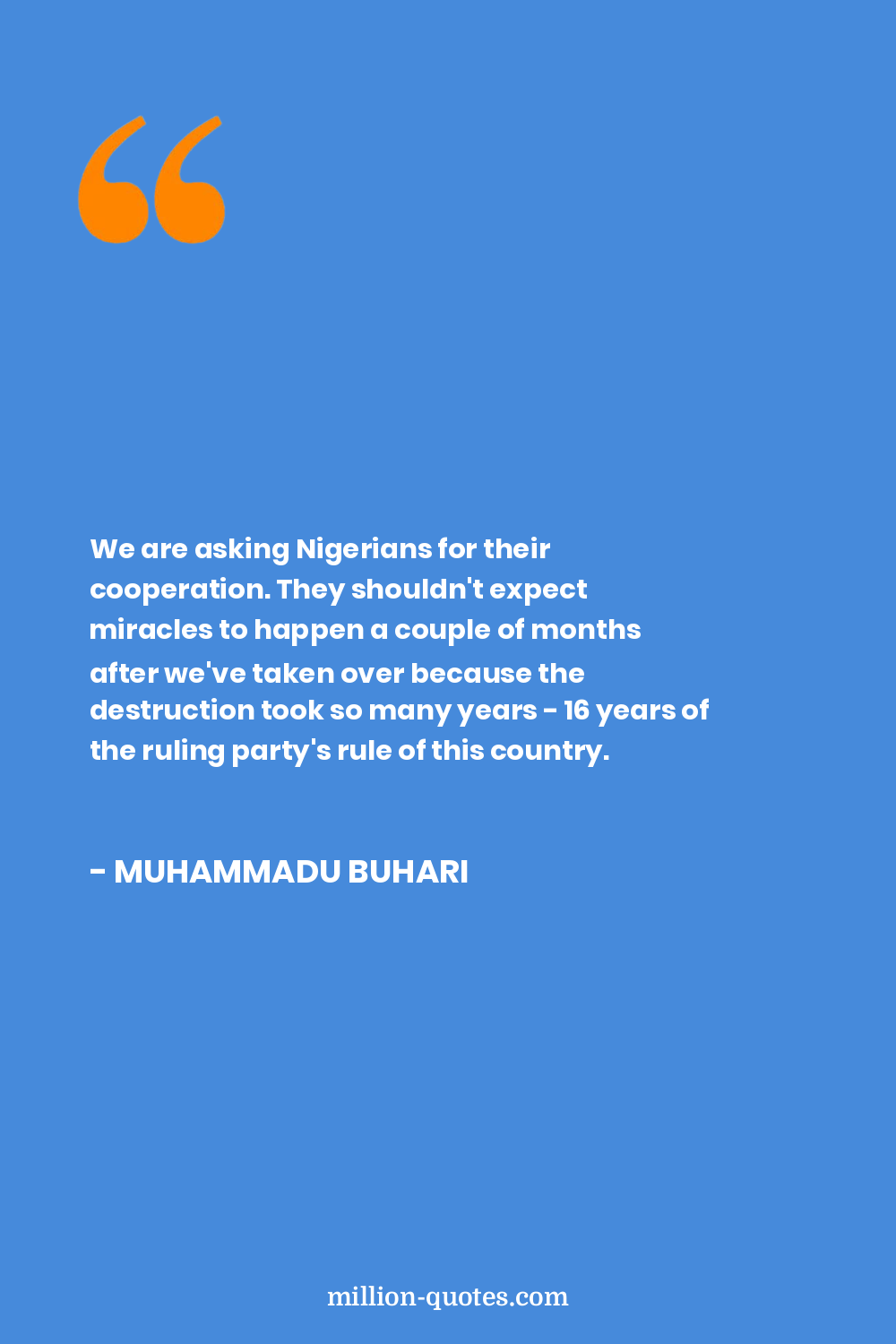 We are asking Nigerians for their cooperation. They shouldn't expect miracles to happen a couple of months after we've taken over because the destruction took so many years - 16 years of the ruling party's rule of this country.