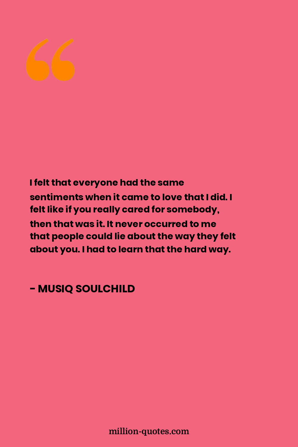 I felt that everyone had the same sentiments when it came to love that I did. I felt like if you really cared for somebody, then that was it. It never occurred to me that people could lie about the way they felt about you. I had to learn that the hard way.