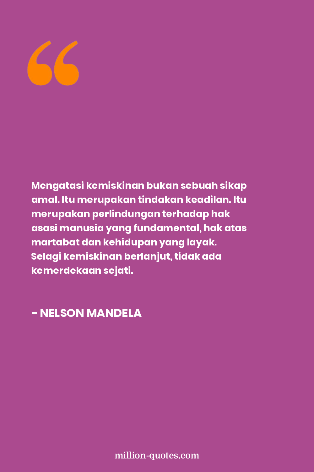 Mengatasi kemiskinan bukan sebuah sikap amal. Itu merupakan tindakan keadilan. Itu merupakan perlindungan terhadap hak asasi manusia yang fundamental, hak atas martabat dan kehidupan yang layak. Selagi kemiskinan berlanjut, tidak ada kemerdekaan sejati.