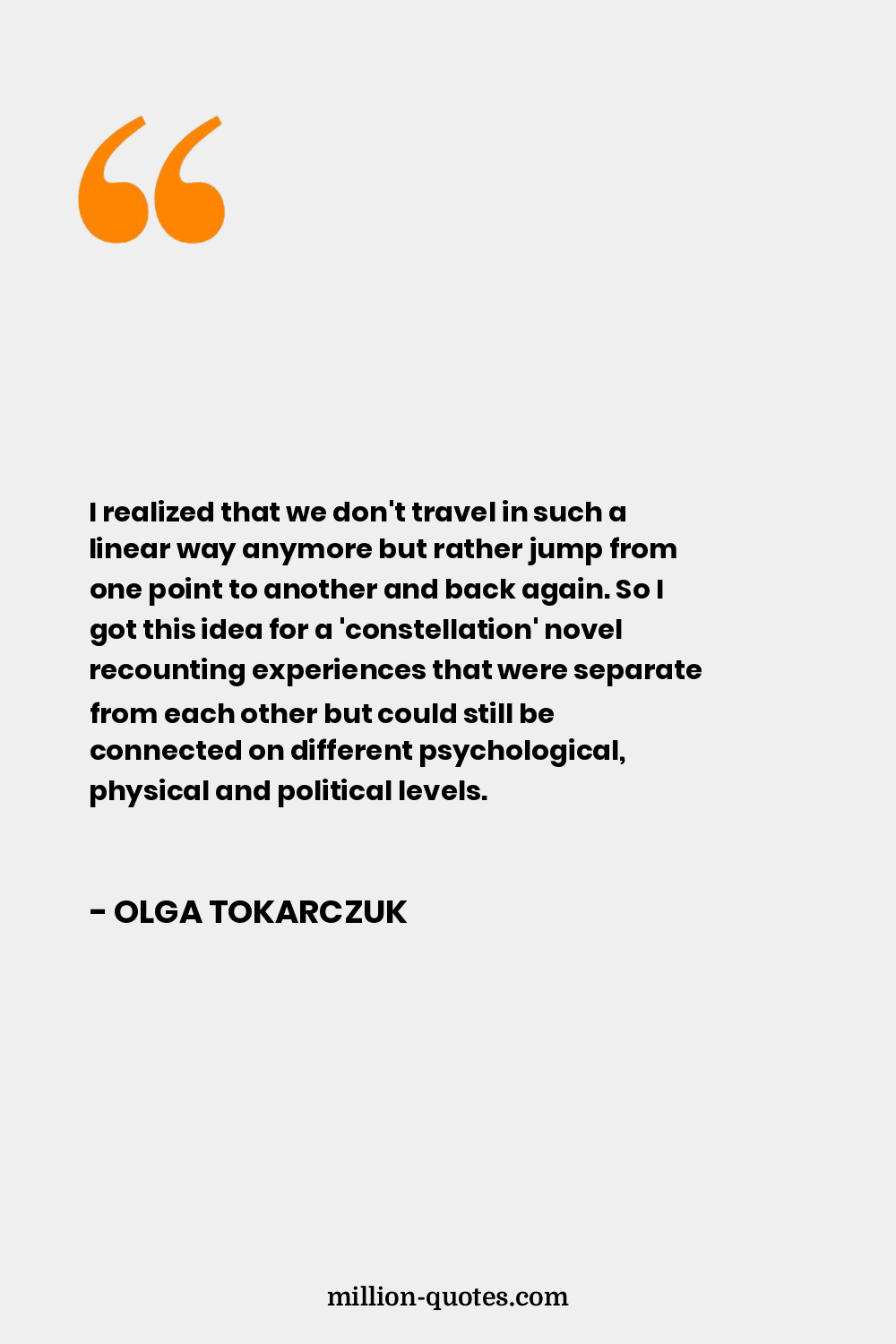 I realized that we don't travel in such a linear way anymore but rather jump from one point to another and back again. So I got this idea for a 'constellation' novel recounting experiences that were separate from each other but could still be connected on different psychological, physical and political levels.