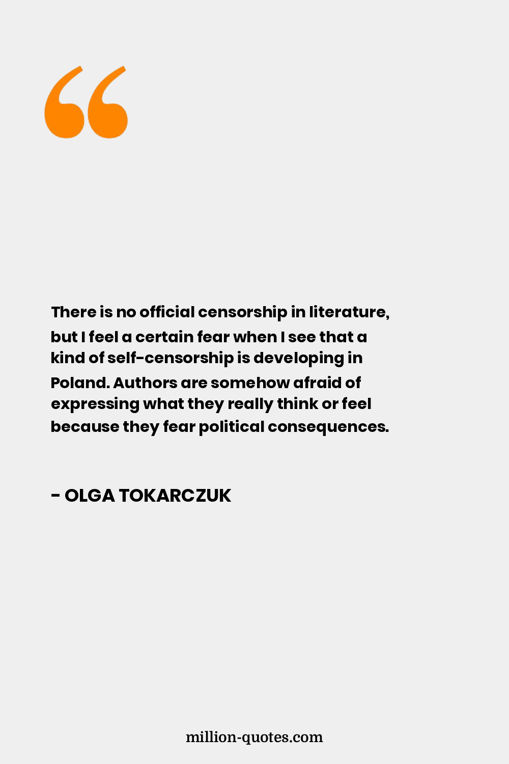 There is no official censorship in literature, but I feel a certain fear when I see that a kind of self-censorship is developing in Poland. Authors are somehow afraid of expressing what they really think or feel because they fear political consequences.
