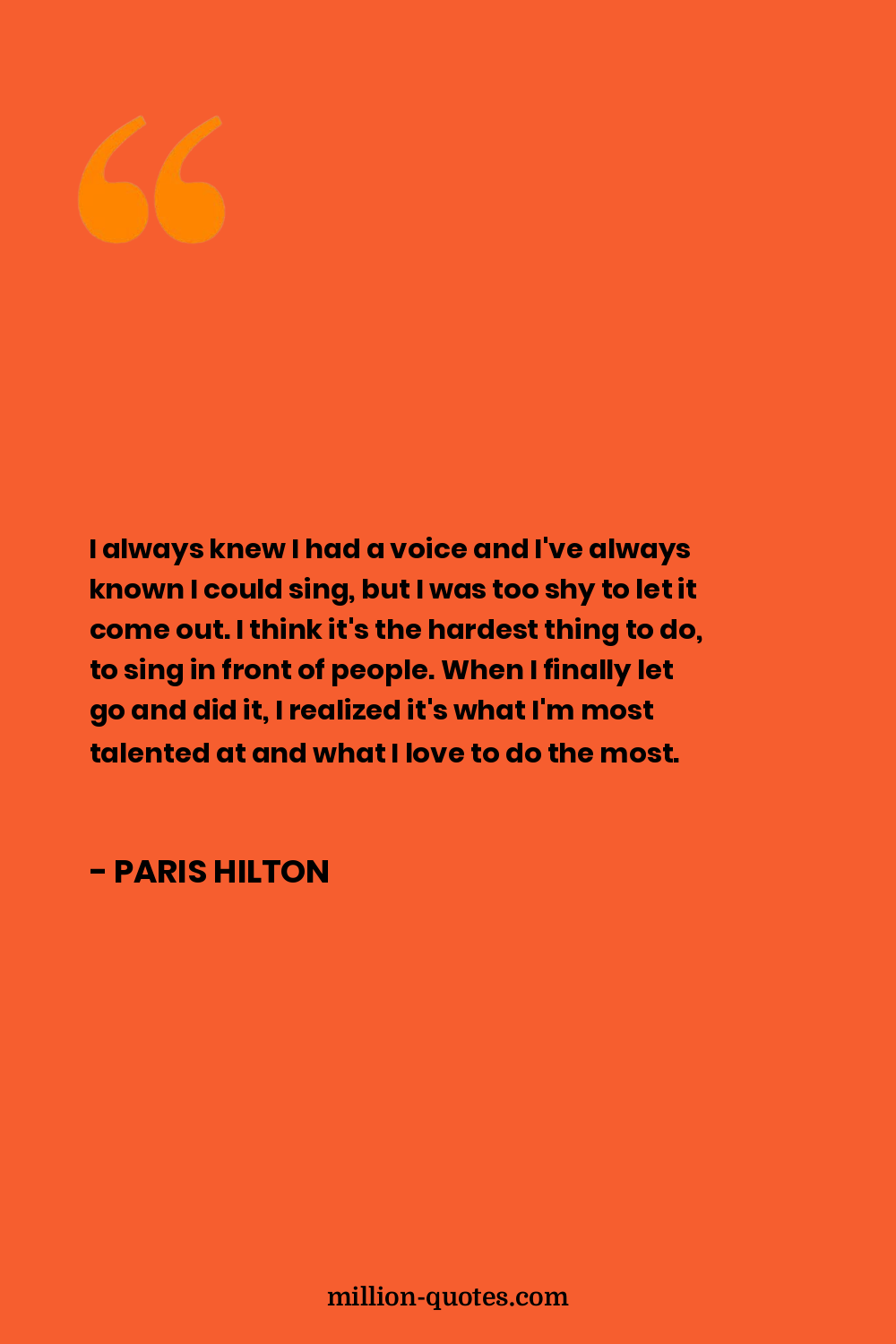 I always knew I had a voice and I've always known I could sing, but I was too shy to let it come out. I think it's the hardest thing to do, to sing in front of people. When I finally let go and did it, I realized it's what I'm most talented at and what I love to do the most.