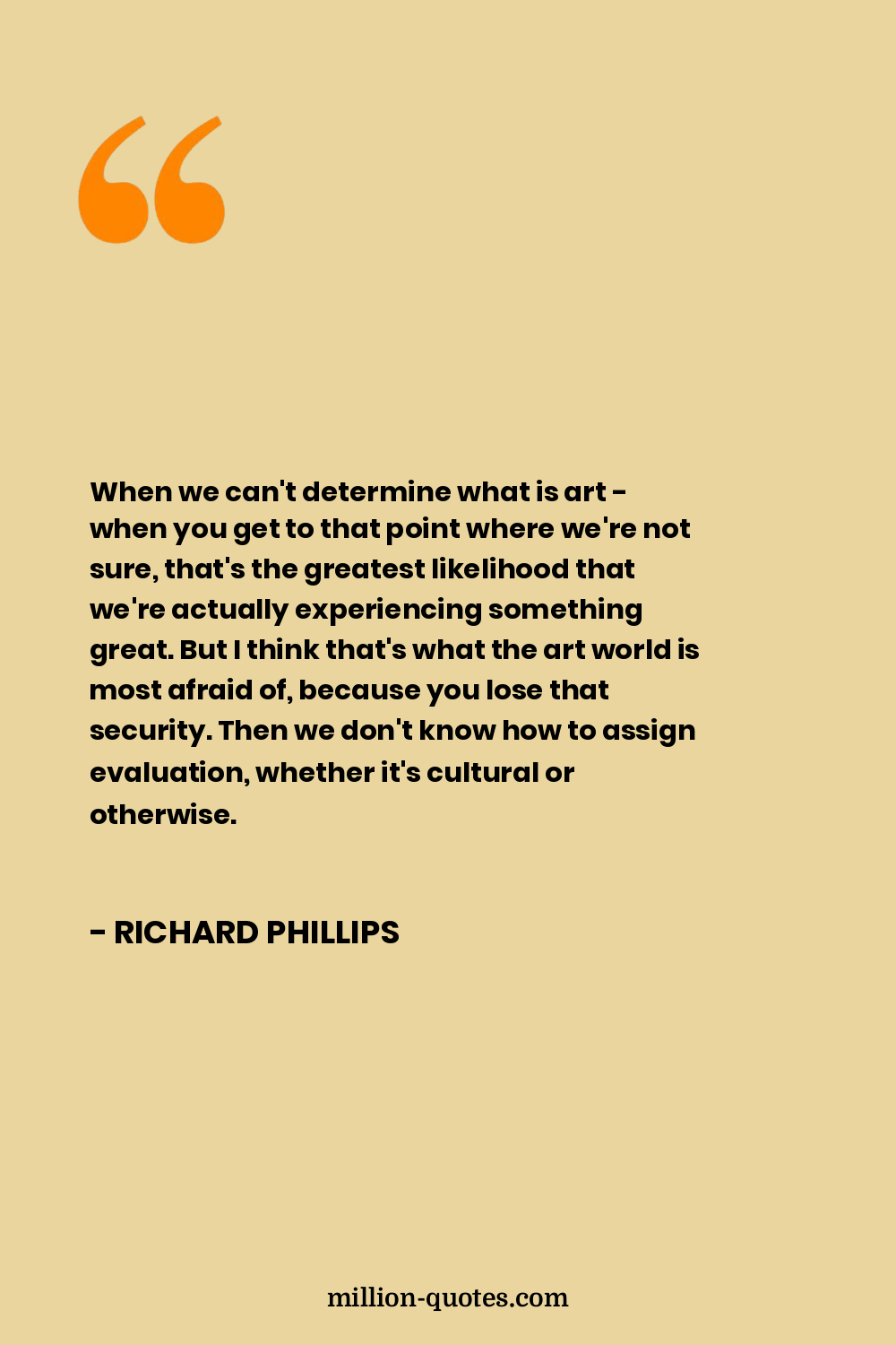 When we can't determine what is art - when you get to that point where we're not sure, that's the greatest likelihood that we're actually experiencing something great. But I think that's what the art world is most afraid of, because you lose that security. Then we don't know how to assign evaluation, whether it's cultural or otherwise.