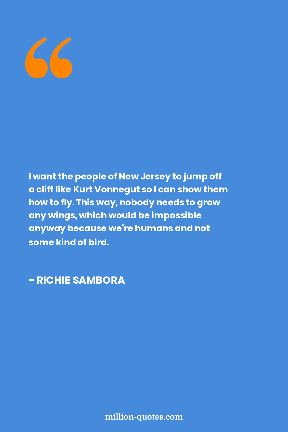 I want the people of New Jersey to jump off a cliff like Kurt Vonnegut so I can show them how to fly. This way, nobody needs to grow any wings, which would be impossible anyway because we're humans and not some kind of bird.