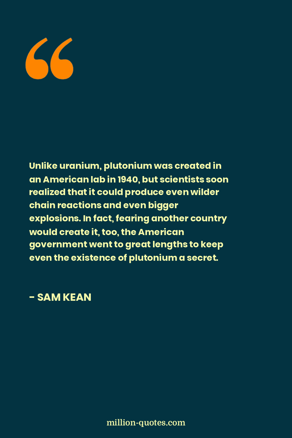 Unlike uranium, plutonium was created in an American lab in 1940, but scientists soon realized that it could produce even wilder chain reactions and even bigger explosions. In fact, fearing another country would create it, too, the American government went to great lengths to keep even the existence of plutonium a secret.