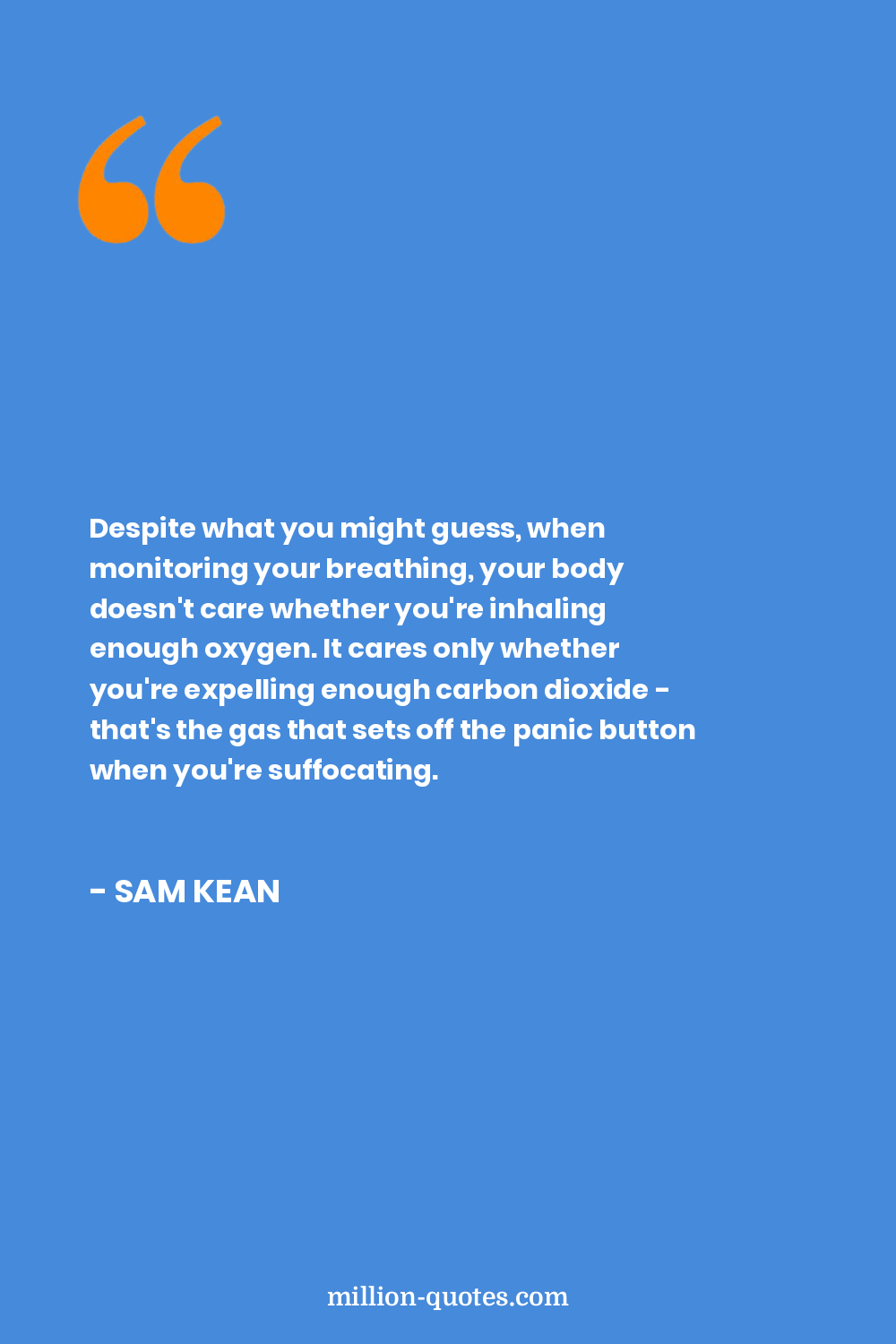 Despite what you might guess, when monitoring your breathing, your body doesn't care whether you're inhaling enough oxygen. It cares only whether you're expelling enough carbon dioxide - that's the gas that sets off the panic button when you're suffocating.